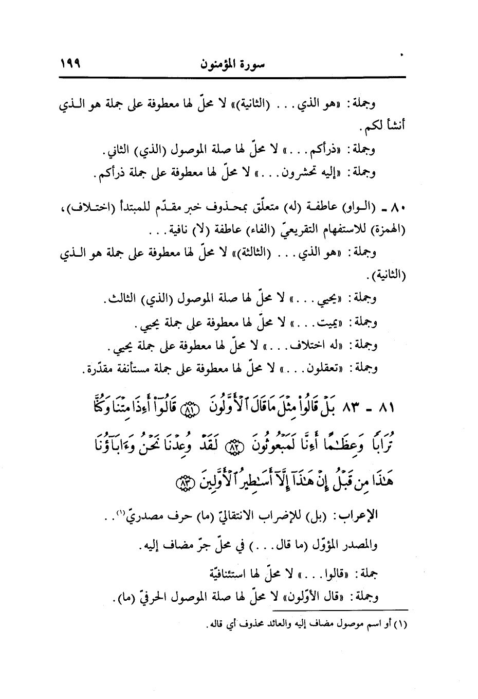 (1) لا يقرّ البصريون جواز توكيد المضارع المسبوق ب (لا) النافية، ويؤوّلون مثل هذه الآية أنّ الفعل هو جواب لقسم مقدّر، والجملة لا محلّ لها، وهذا القسم نعت لفتنة، والفعل هنا مؤكّد للضرورة.. هذا الكلام تأباه النصوص العربيّة العالية الأسلوب كالقرآن، إذ يجوز تأكيد الفعل المنفيّ ب (لا) . هذا.. ويجعل بعضهم الفعل في محلّ جزم ب (لا) الناهية، والكلام محمول على المعنى أي لا تدخلوا في الفتنة، فإنّ من يدخل فيها ينزل عليه جزاء عام.. والجملة في محلّ نصب مقول القول لمقدّر هو نعت لفتنة أي: فتنة مقولا فيها لا تصيبنّ ... والنهي في اللفظ للمصيبة وفي المعنى للمخاطبين. [.....]
