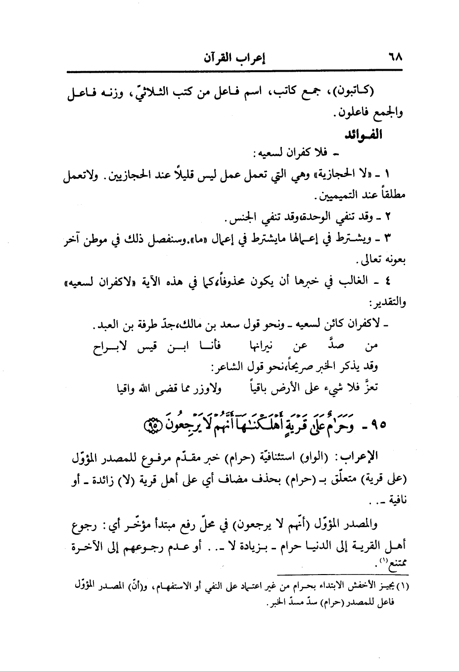 و (النون) للوقاية، و (الياء) ضمير مفعول به، والفاعل ضمير مستتر تقديره أنت (أنظر) مضارع مجزوم، جواب الطلب «1» ، والفاعل ضمير مستتر تقديره أنا (إلى) حرف جرّ و (الكاف) ضمير في محلّ جرّ متعلّق ب (أنظر) ، (قال) مثل الأول (لن) حرف نفي نصب (تراني) مضارع منصوب وعلامة النصب الفتحة المقدّرة على الألف ... و (النون) للوقاية، و (الياء) ضمير مفعول به، والفاعل أنت (الواو) عاطفة (لكن) حرف استدراك (انظر) فعل امر والفاعل أنت (إلى الجبل) جارّ ومجرور متعلّق ب (انظر) ، (الفاء) عاطفة (إن) حرف شرط جازم (استقرّ) ماض مبنيّ في محلّ جزم فعل الشرط (مكان) منصوب على نزع الخافض أي بمكانه ... و (الهاء) ضمير مضاف إليه (الفاء) رابطة لجواب الشرط (سوف) حرف استقبال (تراني) مثل الأول (الفاء) عاطفة (لمّا تجلّى) مثل لمّا جاء، وبناء الفتح مقدّر على الألف (ربّه) مثل الأول (للجبل) جارّ ومجرور متعلّق ب (تجلّى) ، (جعله) مثل كلّمه (دكّا) مفعول به ثان منصوب أي مدكوكا (الواو) (الواو) عاطفة (خرّ)