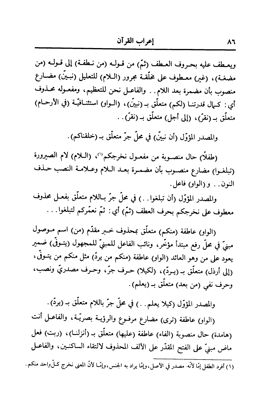 والواو فاعل (العجل) مفعول به أوّل منصوب، والمفعول الثاني محذوف تقديره إلها «1» ، (السين) حرف استقبال (ينال) مضارع مرفوع و (هم) ضمير مفعول به (غضب) فاعل مرفوع (من ربّ) جارّ ومجرور متعلّق ب (ينال) «2» و (هم) ضمير مضاف إليه (الواو) عاطفة (ذلّة) معطوف على غضب مرفوع (في الحياة) جارّ ومجرور متعلّق بمحذوف نعت ل (ذلّة) «3» ، (الدنيا) نعت للحياة مجرور وعلامة الجرّ الكسرة المقدّرة على الألف (الواو) عاطفة (الكاف) حرف جرّ (ذلك) اسم إشارة مبنيّ في محلّ جرّ متعلّق بمحذوف مفعول مطلق عامله نجزي ... و (اللام) للبعد و (الكاف) للخطاب (نجزي) مضارع مرفوع وعلامة الرفع الضمّة المقدّرة على الياء، والفاعل ضمير مستتر تقديره نحن للتعظيم (المفترين) مفعول به منصوب وعلامة النصب الياء.