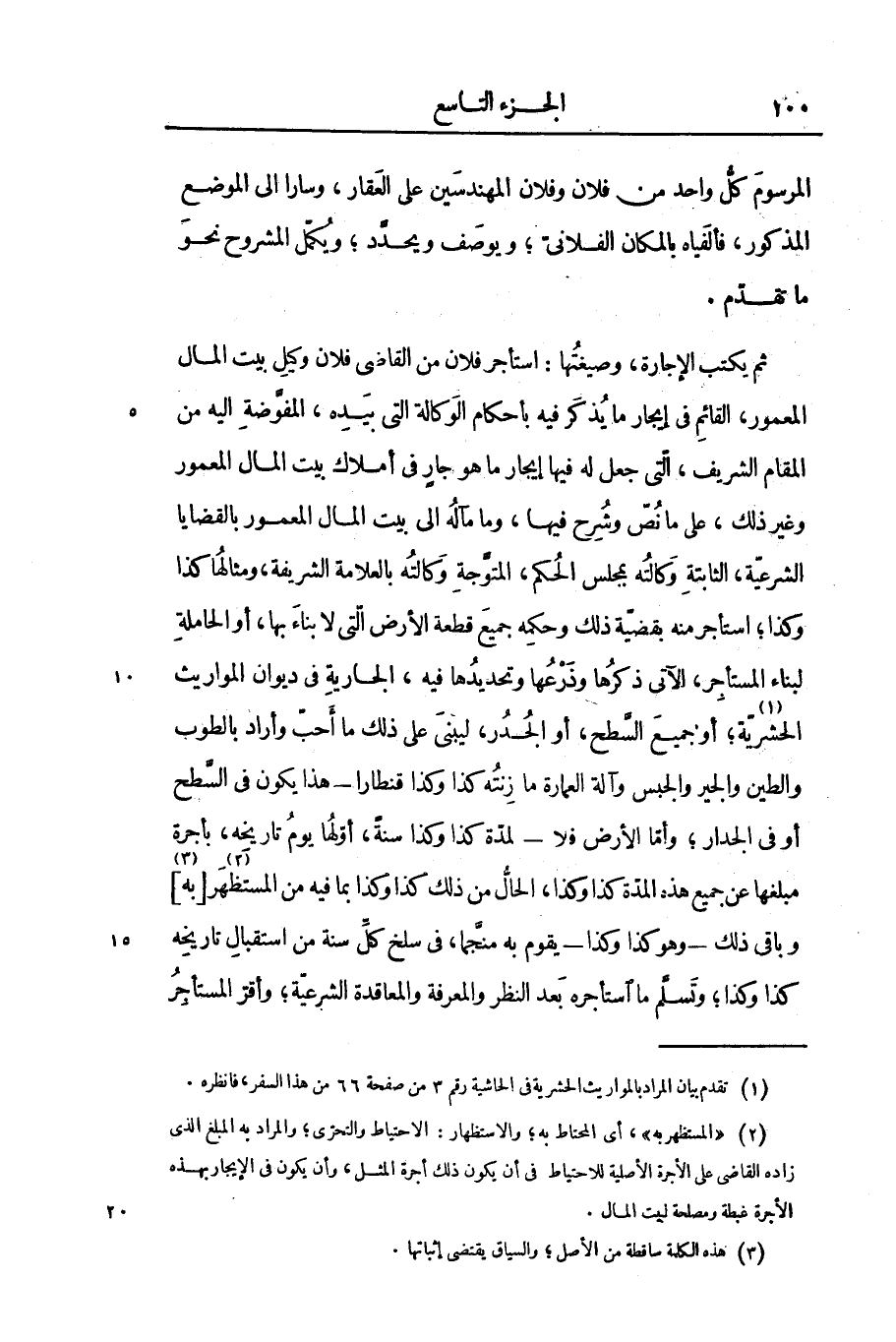 ثمّ يكتب الإجارة، وصيغتها: استأجر فلان من القاضى فلان وكيل بيت المال المعمور، القائم فى إيجار ما يذكر فيه بأحكام الوكالة التى بيده، المفوّضة اليه من المقام الشريف، التى جعل له فيها إيجار ما هو جار فى أملاك بيت المال المعمور وغير ذلك، على ما نصّ وشرح فيها، وما مآله الى بيت المال المعمور بالقضايا الشرعيّة، الثابتة وكالته بمجلس الحكم، المتوجّة وكالته بالعلامة الشريفة، ومثالها كذا وكذا؛ استأجر منه بقضيّة ذلك وحكمه جميع قطعة الأرض التى لا بناء بها، أو الحاملة لبناء المستأجر، الآتى ذكرها وذرعها وتحديدها فيه، الجارية فى ديوان المواريث الحشريّة «1» ؛ أو جميع السّطح، أو الجدر، ليبنى على ذلك ما أحبّ وأراد بالطوب والطين والجير والجبس وآلة العمارة ما زنته كذا وكذا قنطارا- هذا يكون فى السّطح أو فى الجدار؛ وأمّا الأرض فلا- لمدّة كذا وكذا سنة، أوّلها يوم تاريخه، بأجرة مبلغها عن جميع هذه المدّة كذا وكذا، الحالّ من ذلك كذا وكذا بما فيه من المستظهر «2» [به] «3» وباقى ذلك- وهو كذا وكذا- يقوم به منجّما، فى سلخ كلّ سنة من استقبال تاريخه كذا وكذا؛ وتسلّم ما استأجره بعد النظر والمعرفة والمعاقدة الشرعيّة؛ وأقرّ المستأجر