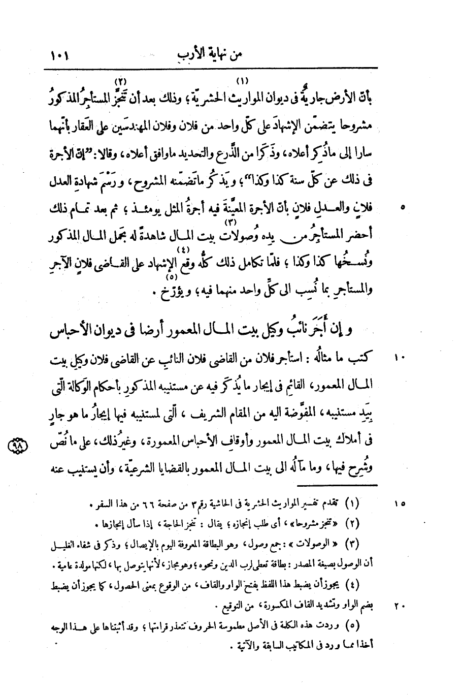 بأنّ الأرض جارية فى ديوان المواريث «1» الحشريّة؛ وذلك بعد أن تنجّز «2» المستأجر المذكور مشروحا يتضمّن الإشهاد على كلّ واحد من فلان وفلان المهندسين على العقار بأنّهما سارا إلى ما ذكر أعلاه، وذكرا من الذّرع والتحديد ما وافق أعلاه، وقالا: «إنّ الأجرة فى ذلك عن كلّ سنة كذا وكذا» ؛ ويذكر ما تضمّنه المشروح، ورسم شهادة العدل فلان والعدل فلان بأنّ الأجرة المعيّنة فيه أجرة المثل يومئذ؛ ثم بعد تمام ذلك أحضر المستأجر من يده وصولات «3» بيت المال شاهدة له بحمل المال المذكور ونسخها كذا وكذا؛ فلمّا تكامل ذلك كلّه وقع «4» الإشهاد على القاضى فلان الآجر والمستأجر بما نسب الى كلّ واحد منهما فيه؛ ويؤرّخ «5» .
