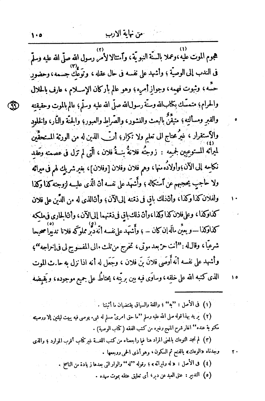 ، وعملا بالسنّة النبويّة، وامتثالا لأمر «2» رسول الله صلى الله عليه وسلم فى الندب إلى الوصيّة؛ وأشهد على نفسه فى حال عقله، وتوعّك «3» جسمه، وحضور حسّه، وثبوت فهمه، وجواز أمره؛ وهو عالم بأركان الإسلام، عارف بالحلال والحرام؛ متمسّك بكتاب الله وسنّة رسول الله صلى الله عليه وسلم؛ عالم بالموت وحقيقته والقبر ومسألته؛ متيقّن بالبعث والنشور، والصّراط والعبور؛ والجنّة والنّار، والخلود والاستقرار، غير محتاج الى تعليم ولا تكرار؛ أنّ الذين له من الورثة المستحقّين لميراثه «4» المستوعبين لجميعه: زوجته فلانة بنة فلان، التى لم تزل فى عصمته وعقد نكاحه إلى الآن؛ وأولاده منها، وهم فلان وفلان [وفلان] ، بغير شريك لهم فى ميراثه ولا حاجب يحجبهم عن استكماله؛ وأشهد على نفسه أنّ الذى عليه لزوجته كذا وكذا ولفلان كذا وكذا، وأنّ ذلك باق فى ذمّته إلى الآن؛ وأنّ الذى له من الدّين على فلان كذا وكذا، وعلى فلان كذا وكذا، وأنّ ذلك باق فى ذمّتهما إلى الآن، وأنّ الجارى فى ملكه كذا وكذا- ويعيّن ماله إن كان-؛ وأشهد على نفسه أنّه دبّر «5» مملوكه فلانا تدبيرا «6» صحيحا شرعيّا، وقال له: «أنت حرّ بعد موتى، تخرج من ثلث مالى المفسوح لى فى إخراجه» ؛ وأشهد على نفسه أنّه أوصى فلان بن فلان، وجعل له أنه اذا نزل به حادث الموت الذى كتبه الله على خلقه، وساوى فيه بين بريّته، يحتاط على جميع موجوده، ويقبضه