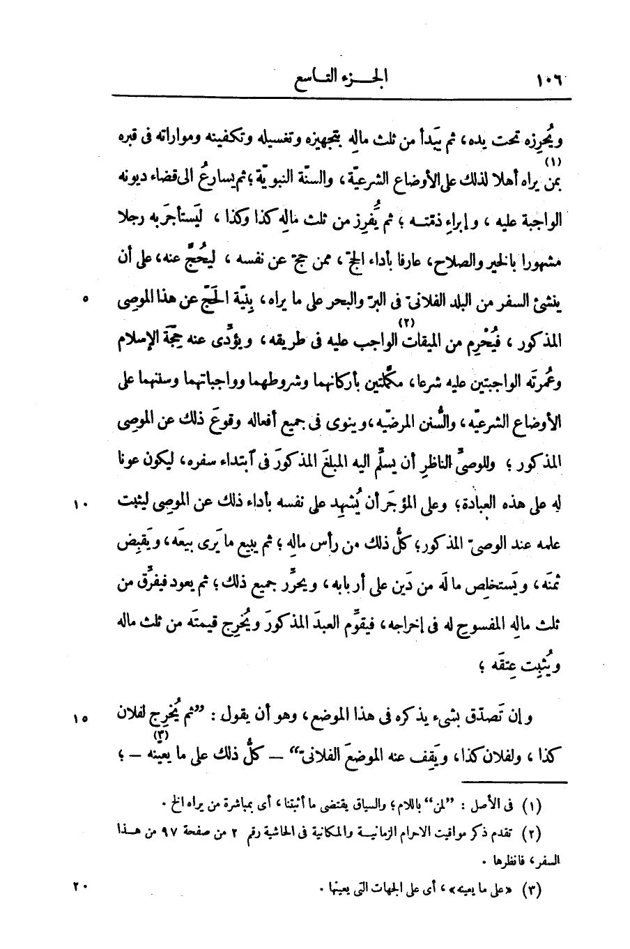 ويحرزه تحت يده، ثم يبدأ من ثلث ماله بتجهيزه وتغسيله وتكفينه ومواراته فى قبره بمن «1» يراه أهلا لذلك على الأوضاع الشرعيّة، والسنّة النبويّة؛ ثم يسارع الى قضاء ديونه الواجبة عليه، وإبراء ذمّته؛ ثم يفرز من ثلث ماله كذا وكذا، ليستأجر به رجلا مشهورا بالخير والصلاح، عارفا بأداء الحجّ، ممن حجّ عن نفسه، ليحجّ عنه، على أن ينشئ السفر من البلد الفلانىّ فى البرّ والبحر على ما يراه، بنيّة الحجّ عن هذا الموصى المذكور، فيحرم من الميقات «2» الواجب عليه فى طريقه، ويؤدّى عنه حجّة الإسلام وعمرته الواجبتين عليه شرعا، مكمّلتين بأركانهما وشروطهما وواجباتهما وسننهما على الأوضاع الشرعيّة، والسّنن المرضيّة، وينوى فى جميع أفعاله وقوع ذلك عن الموصى المذكور؛ وللوصىّ الناظر أن يسلّم اليه المبلغ المذكور فى ابتداء سفره، ليكون عونا له على هذه العبادة؛ وعلى المؤجر أن يشهد على نفسه بأداء ذلك عن الموصى ليثبت علمه عند الوصىّ المذكور؛ كلّ ذلك من رأس ماله؛ ثم يبيع ما يرى بيعه، ويقبض ثمنه، ويستخلص ماله من دين على أربابه، ويحرّر جميع ذلك؛ ثم يعود فيفرّق من ثلث ماله المفسوح له فى إخراجه، فيقوّم العبد المذكور ويخرج قيمته من ثلث ماله ويثبت عتقه؛ وإن تصدّق بشىء يذكره فى هذا الموضع، وهو أن يقول: «ثمّ يخرج لفلان كذا، ولفلان كذا، ويقف عنه الموضع الفلانىّ» - كلّ ذلك على ما يعيّنه «3» -؛