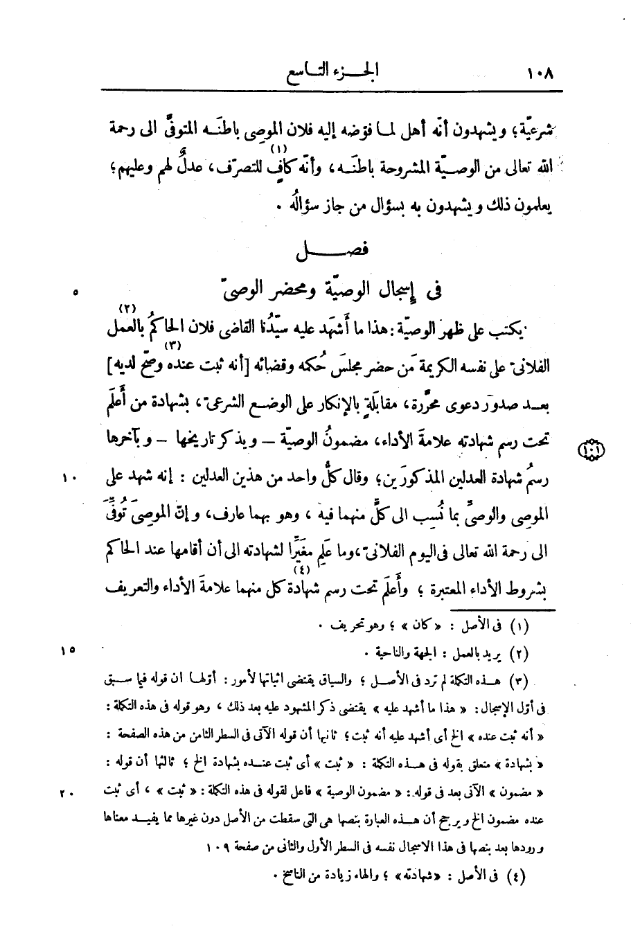 يكتب على ظهر الوصيّة: هذا ما أشهد عليه سيّدنا القاضى فلان الحاكم بالعمل «2» الفلانىّ على نفسه الكريمة من حضر مجلس حكمه وقضائه [أنه ثبت عنده «3» وصحّ لديه] بعد صدور دعوى محرّرة، مقابلة بالإنكار على الوضع الشرعىّ، بشهادة من أعلم تحت رسم شهادته علامة الأداء، مضمون الوصيّة- ويذكر تاريخها- وبآخرها رسم شهادة العدلين المذكورين؛ وقال كلّ واحد من هذين العدلين: إنه شهد على الموصى والوصىّ بما نسب الى كلّ منهما فيه، وهو بهما عارف، وإنّ الموصى توفّى الى رحمة الله تعالى فى اليوم الفلانىّ، وما علم مغيّرا لشهادته الى أن أقامها عند الحاكم بشروط الأداء المعتبرة؛ وأعلم تحت رسم شهادة «4» كل منهما علامة الأداء والتعريف