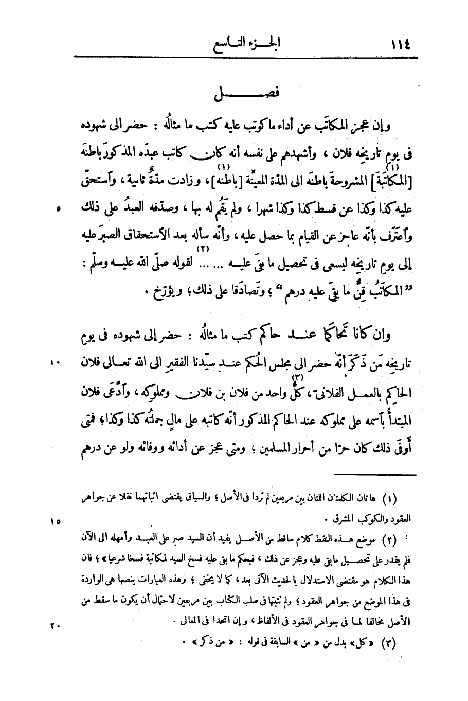 كتب ما مثاله: حضر إلى شهوده فى يوم تاريخه من ذكر أنّه حضر الى مجلس الحكم عند سيّدنا الفقير الى الله تعالى فلان الحاكم بالعمل الفلانىّ، كلّ «4» واحد من فلان بن فلان ومملوكه، وادّعى فلان المبتدأ باسمه على مملوكه عند الحاكم المذكور أنّه كاتبه على مال جملته كذا وكذا؛ فمتى أوفى ذلك كان حرّا من أحرار المسلمين؛ ومتى عجز عن أدائه ووفائه ولو عن درهم