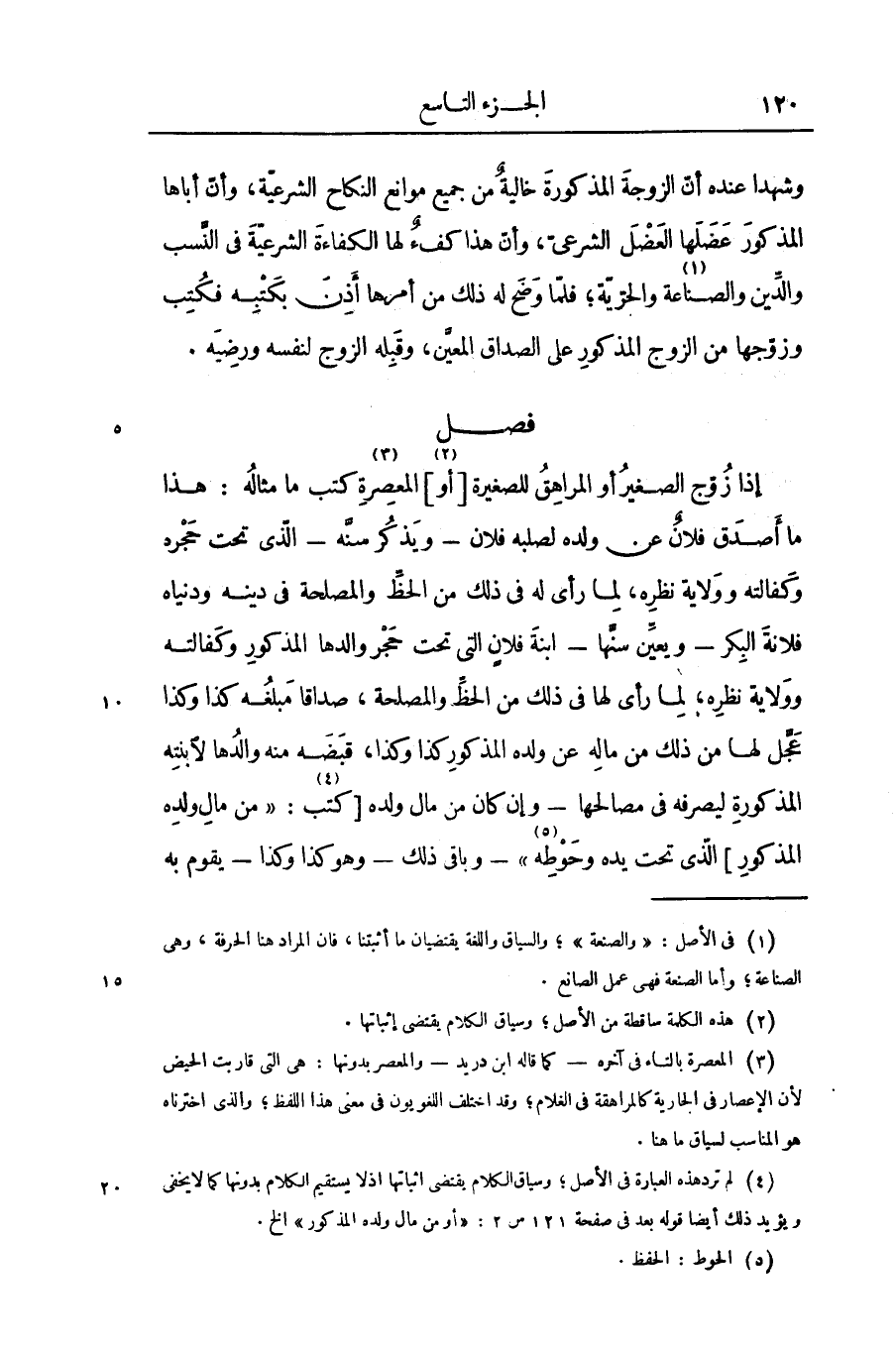 «3» كتب ما مثاله: هذا ما أصدق فلان عن ولده لصلبه فلان- ويذكر سنّه- الذى تحت حجره وكفالته وولاية نظره، لما رأى له فى ذلك من الحظّ والمصلحة فى دينه ودنياه فلانة البكر- ويعيّن سنّها- ابنة فلان التى تحت حجر والدها المذكور وكفالته وولاية نظره، لما رأى لها فى ذلك من الحظّ والمصلحة، صداقا مبلغه كذا وكذا عجّل لها من ذلك من ماله عن ولده المذكور كذا وكذا، قبضه منه والدها لابنته المذكورة ليصرفه فى مصالحها- وإن كان من مال ولده [كتب «4» : «من مال ولده المذكور] الذى تحت يده وحوطه «5» » - وباقى ذلك- وهو كذا وكذا- يقوم به