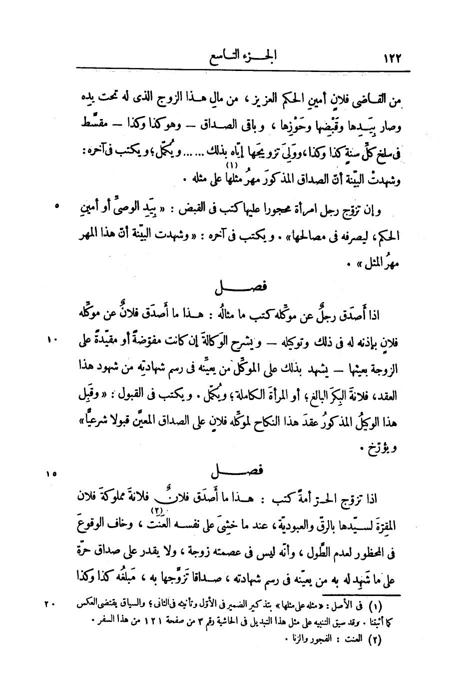 كتب: هذا ما أصدق فلان فلانة مملوكة فلان المقرّة لسيّدها بالرقّ والعبوديّة، عند ما خشى على نفسه العنت «2» ، وخاف الوقوع فى المحظور لعدم الطّول، وأنّه ليس فى عصمته زوجة، ولا يقدر على صداق حرّة على ما شهد له به من يعيّنه فى رسم شهادته، صداقا تزوّجها به، مبلغه كذا وكذا