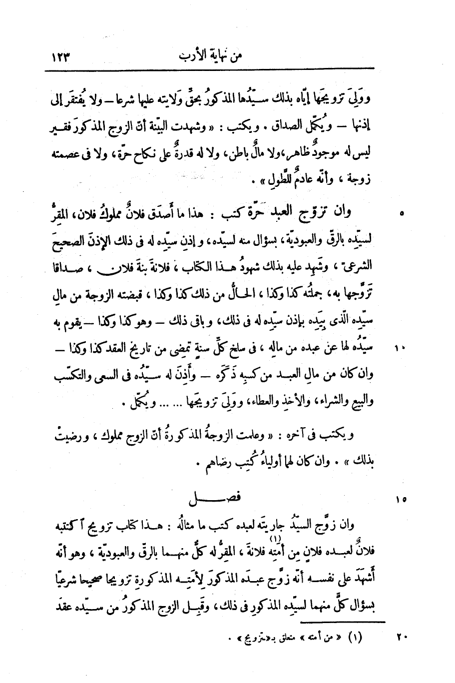 وولى تزويجها إيّاه بذلك سيّدها المذكور بحقّ ولايته عليها شرعا- ولا يفتقر إلى إذنها- ويكمّل الصداق. ويكتب: «وشهدت البيّنة أنّ الزوج المذكور فقير ليس له موجود ظاهر، ولا مال باطن، ولا له قدرة على نكاح حرّة، ولا فى عصمته زوجة، وأنّه عادم للطّول» .