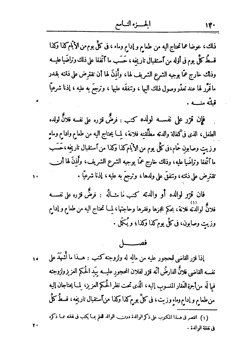 كتب: فرض قرّره على نفسه فلان لولده الطفل، الذى فى كفالة والدته مطلّقته فلانة، لما يحتاج اليه من طعام وادام وماء وزيت وصابون حمّام، فى كلّ يوم من الأيّام كذا وكذا من استقبال تاريخه، حسب ما اتّفقا وتراضيا عليه، وذلك خارج عمّا يوجبه الشرع الشريف، وأذن لها أن تقترض على ذمّته، وتنفق على ولدها، وترجع به عليه، إذنا شرعيّا.