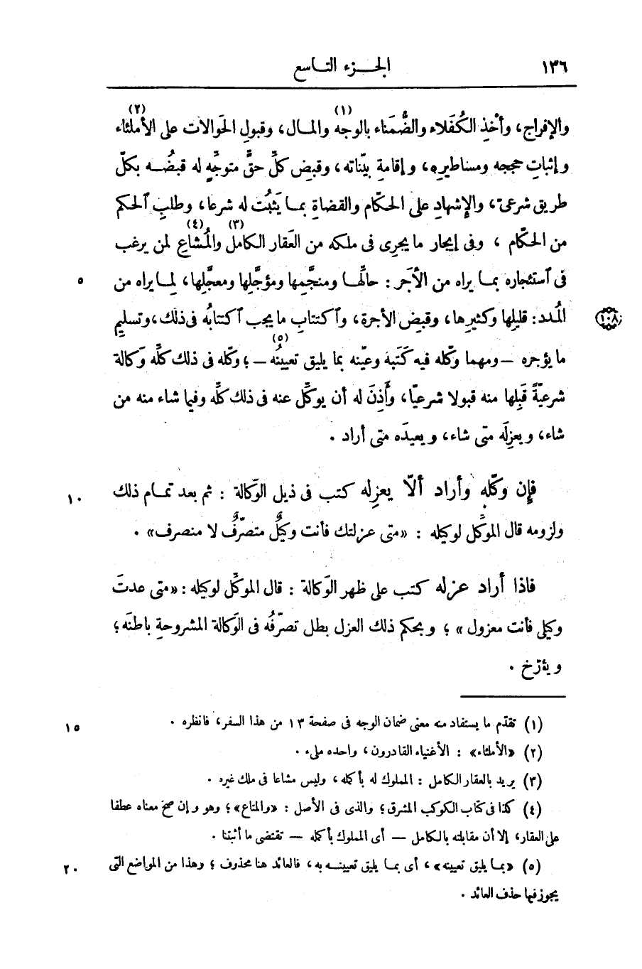 والإفراج، وأخذ الكفلاء والضّمناء بالوجه «1» والمال، وقبول الحوالات على الأملئاء «2» وإثبات حججه ومساطيره، وإقامة بيّناته، وقبض كلّ حقّ متوجّه له قبضه بكلّ طريق شرعىّ، والإشهاد على الحكّام والقضاة بما يثبت له شرعا، وطلب الحكم من الحكّام، وفى إيجار ما يجرى فى ملكه من العقار الكامل «3» والمشاع «4» لمن يرغب فى استئجاره بما يراه من الأجر: حالّها ومنجّمها ومؤجّلها ومعجّلها، لما يراه من المدد: قليلها وكثيرها، وقبض الأجرة، واكتتاب ما يجب اكتتابه فى ذلك، وتسليم ما يؤجره- ومهما وكّله فيه كتبه وعيّنه بما يليق تعيينه «5» -؛ وكّله فى ذلك كلّه وكالة شرعيّة قبلها منه قبولا شرعيّا، وأذن له أن يوكّل عنه فى ذلك كلّه وفيما شاء منه من شاء، ويعزله متى شاء، ويعيده متى أراد.