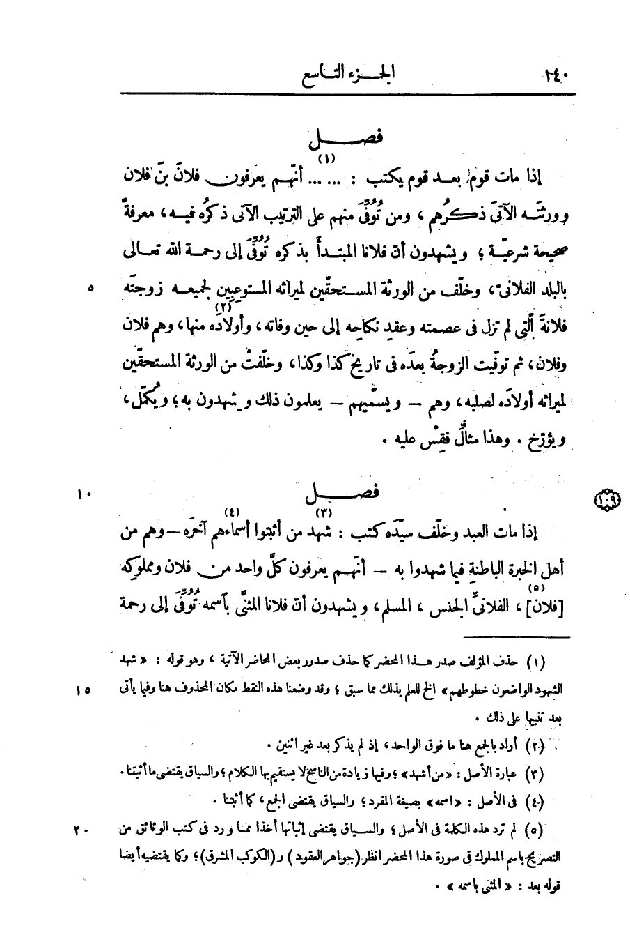 يكتب: ... «1» أنّهم يعرفون فلان بن فلان وورثته الآتى ذكرهم، ومن توفّى منهم على الترتيب الآتى ذكره فيه، معرفة صحيحة شرعيّة؛ ويشهدون أنّ فلانا المبتدأ بذكره توفّى إلى رحمة الله تعالى بالبلد الفلانىّ، وخلّف من الورثة المستحقّين لميراثه المستوعبين لجميعه زوجته فلانة التى لم تزل فى عصمته وعقد نكاحه إلى حين وفاته، وأولاده «2» منها، وهم فلان وفلان، ثم توفّيت الزوجة بعده فى تاريخ كذا وكذا، وخلّفت من الورثة المستحقّين لميراثه أولاده لصلبه، وهم- ويسمّيهم- يعلمون ذلك ويشهدون به؛ ويكمّل، ويؤرّخ. وهذا مثال فقس عليه.