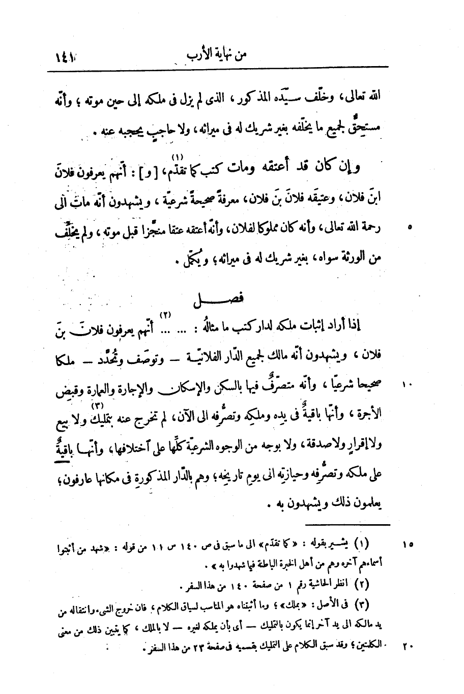 كتب ما مثاله: ... «2» ... أنّهم يعرفون فلان بن فلان، ويشهدون أنّه مالك لجميع الدّار الفلانيّة- وتوصف وتحدّد- ملكا صحيحا شرعيّا، وأنّه متصرّف فيها بالسكن والإسكان والإجارة والعمارة وقبض الأجرة، وأنّها باقية فى يده وملكه وتصرّفه الى الآن، لم تخرج عنه بتمليك «3» ولا بيع ولا إقرار ولا صدقة، ولا بوجه من الوجوه الشرعيّة كلّها على اختلافها، وأنّها باقية على ملكه وتصرّفه وحيازته الى يوم تاريخه؛ وهم بالدّار المذكورة فى مكانها عارفون؛ يعلمون ذلك ويشهدون به.