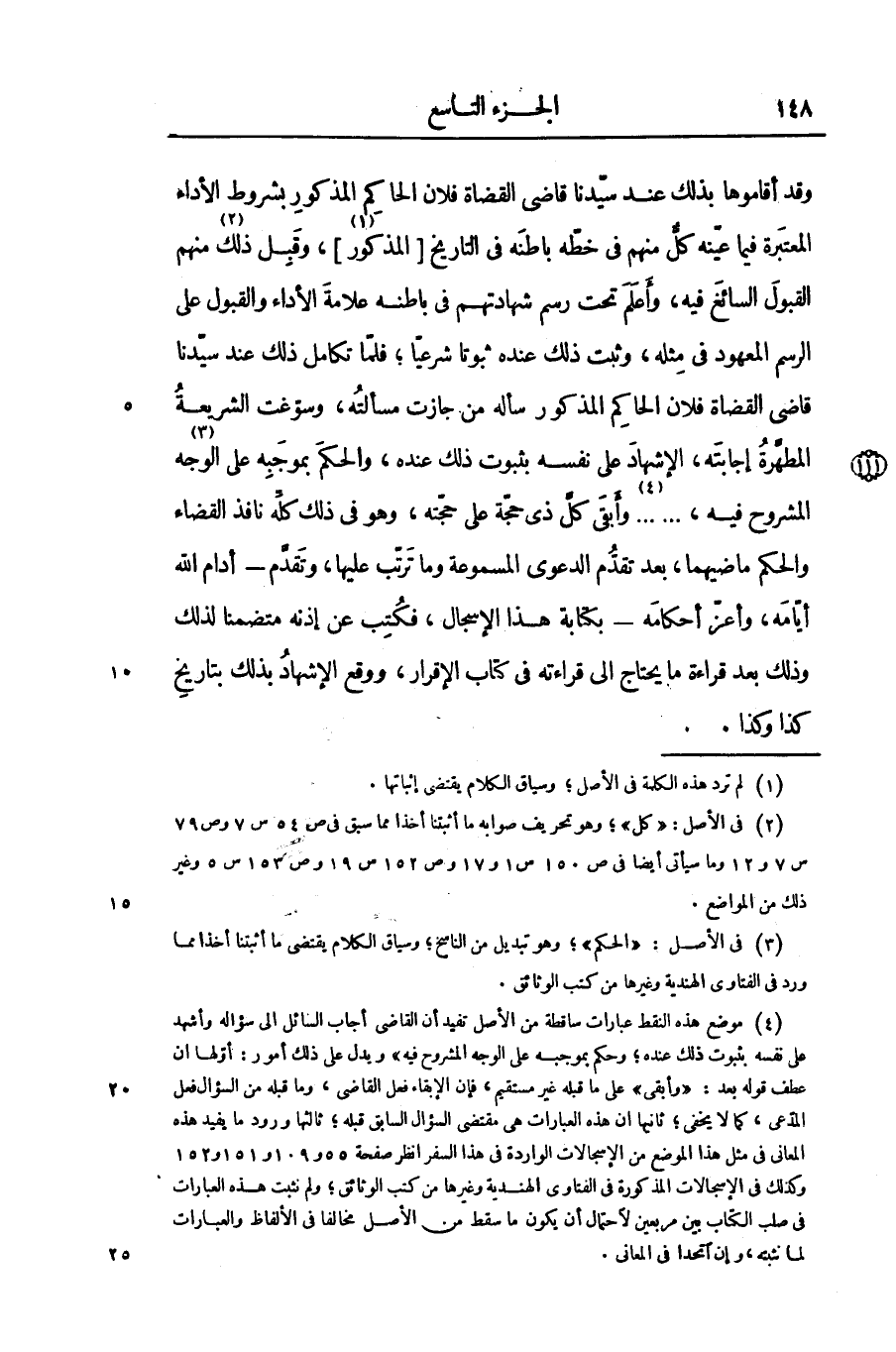وقد أقاموها بذلك عند سيّدنا قاضى القضاة فلان الحاكم المذكور بشروط الأداء المعتبرة فيما عيّنه كلّ منهم فى خطّه باطنه فى التاريخ [المذكور «1» ] ، وقبل ذلك «2» منهم القبول السائغ فيه، وأعلم تحت رسم شهادتهم فى باطنه علامة الأداء والقبول على الرسم المعهود فى مثله، وثبت ذلك عنده ثبوتا شرعيّا؛ فلمّا تكامل ذلك عند سيّدنا قاضى القضاة فلان الحاكم المذكور سأله من جازت مسألته، وسوّغت الشريعة المطهّرة إجابته، الإشهاد على نفسه بثبوت ذلك عنده، والحكم بموجبه على الوجه «3» المشروح فيه، ... «4» ... وأبقى كلّ ذى حجّة على حجّته، وهو فى ذلك كلّه نافذ القضاء والحكم ماضيهما، بعد تقدّم الدعوى المسموعة وما ترتّب عليها، وتقدّم- أدام الله أيّامه، وأعزّ أحكامه- بكتابة هذا الإسجال، فكتب عن إذنه متضمنا لذلك وذلك بعد قراءة ما يحتاج الى قراءته فى كتاب الإقرار، ووقع الإشهاد بذلك بتاريخ كذا وكذا.