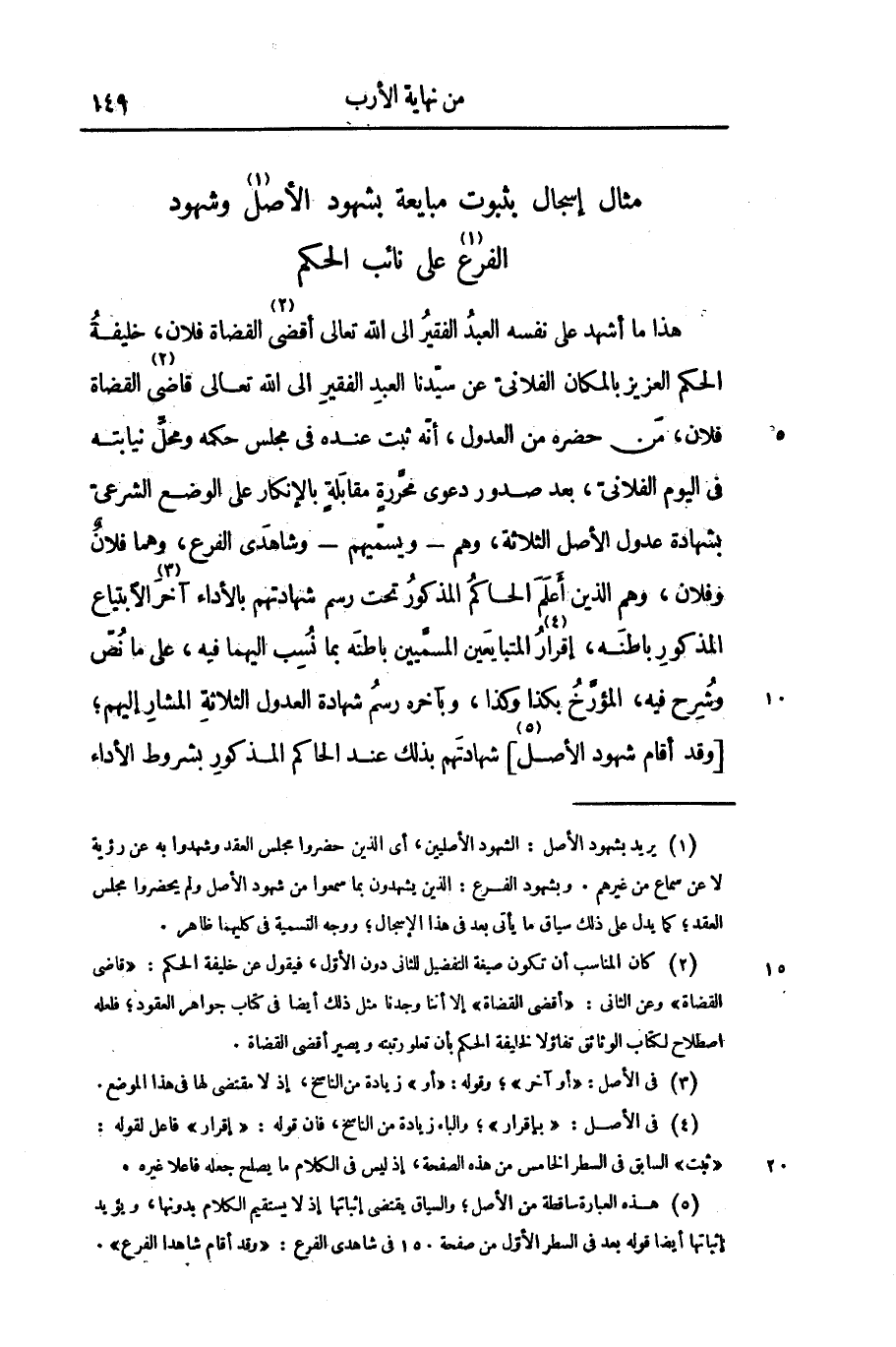هذا ما أشهد على نفسه العبد الفقير الى الله تعالى أقضى «3» القضاة فلان، خليفة الحكم العزيز بالمكان الفلانىّ عن سيّدنا العبد الفقير الى الله تعالى قاضى «4» القضاة فلان، من حضره من العدول، أنّه ثبت عنده فى مجلس حكمه ومحلّ نيابته فى اليوم الفلانىّ، بعد صدور دعوى محرّرة مقابلة بالإنكار على الوضع الشرعىّ بشهادة عدول الأصل الثلاثة، وهم- ويسمّيهم- وشاهدى الفرع، وهما فلان وفلان، وهم الذين أعلم الحاكم المذكور تحت رسم شهادتهم بالأداء آخر «5» الابتياع المذكور باطنه، إقرار «6» المتبايعين المسمّيين باطنه بما نسب اليهما فيه، على ما نصّ وشرح فيه، المؤرّخ بكذا وكذا، وبآخره رسم شهادة العدول الثلاثة المشار إليهم؛ [وقد أقام شهود الأصل «7» ] شهادتهم بذلك عند الحاكم المذكور بشروط الأداء
