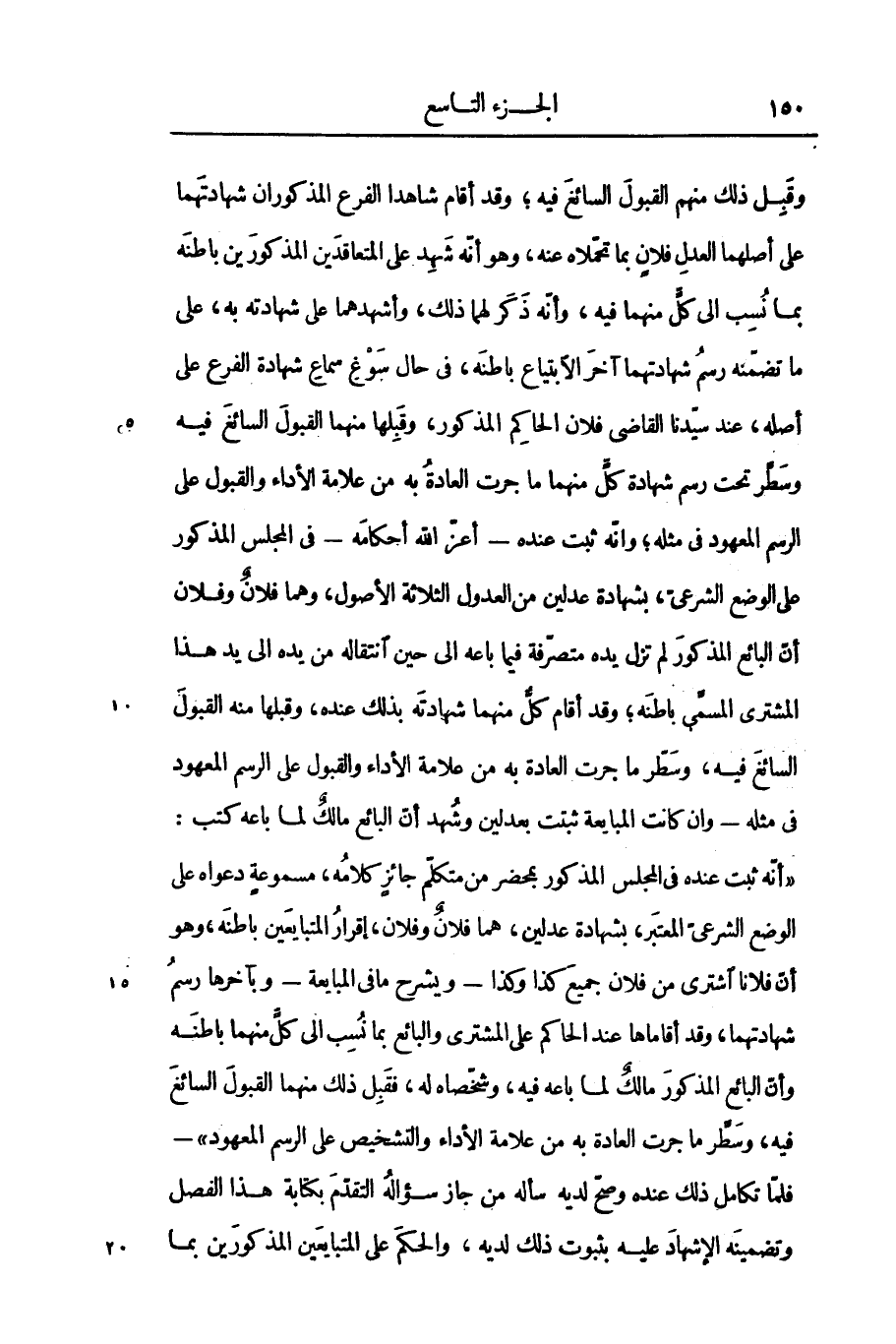 «أنّه ثبت عنده فى المجلس المذكور بمحضر من متكلّم جائز كلامه، مسموعة دعواه على الوضع الشرعىّ المعتبر، بشهادة عدلين، هما فلان وفلان، إقرار المتبايعين باطنه، وهو أنّ فلانا اشترى من فلان جميع كذا وكذا- ويشرح ما فى المبايعة- وبآخرها رسم شهادتهما، وقد أقاماها عند الحاكم على المشترى والبائع بما نسب الى كلّ منهما باطنه وأنّ البائع المذكور مالك لما باعه فيه، وشخّصاه له، فقبل ذلك منهما القبول السائغ فيه، وسطّر ما جرت العادة به من علامة الأداء والتشخيص على الرسم المعهود» - فلمّا تكامل ذلك عنده وصحّ لديه سأله من جاز سؤاله التقدّم بكتابة هذا الفصل وتضمينه الإشهاد عليه بثبوت ذلك لديه، والحكم على المتبايعين المذكورين بما