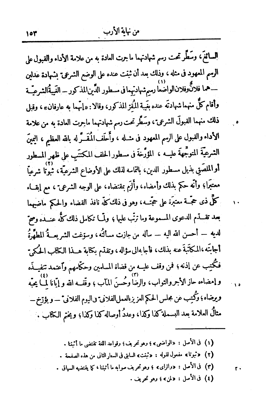 السائغ، وسطّر تحت رسم شهادتهما ما جرت العادة به من علامة الأداء والقبول على الرسم المعهود فى مثله، وذلك بعد أن ثبتت عنده على الوضع الشرعىّ بشهادة عدلين- هما فلان وفلان الواضعا «1» رسم شهادتهما فى مسطور الدّين المذكور- الغيبة الشرعيّة وأقام كلّ منهما شهادته عنده بغيبة المقرّ المذكور، وقالا: «إنّهما به عارفان» ، وقبل ذلك منهما القبول الشرعىّ، وسطّر تحت رسم شهادتهما ما جرت العادة به من علامة الأداء والقبول على الرسم المعهود فى مثله، وأحلف المقرّ له بالله العظيم، اليمين الشرعيّة المتوجّهة عليه، المؤرّخة فى مسطور الحلف المكتتب على ظهر المسطور أو الملصق بذيل مسطور الدين، بالتماسه لذلك على الأوضاع الشرعيّة، ثبوتا «2» شرعيّا معتبرا؛ وأنّه حكم بذلك وأمضاه، وألزم بمقتضاه، على الوجه الشرعىّ، مع إبقاء كلّ ذى حجّة معتبرة على حجّته، وهو فى ذلك كلّه نافذ القضاء والحكم ماضيهما بعد تقدّم الدعوى المسموعة وما ترتّب عليها؛ ولمّا تكامل ذلك كلّه عنده وصحّ لديه- أحسن الله اليه- سأله من جازت مسألته، وسوّغت الشريعة المطهّرة أجابته، المكاتبة عنه بذلك، فأجابه الى سؤاله، وتقدّم بكتابة هذا الكتاب الحكمىّ فكتب عن إذنه؛ فمن وقف عليه من قضاة المسلمين وحكّامهم واعتمد تنفيذه وإمضاءه حاز الأجر والثواب، والرضا «3» وحسن المآب؛ وفّقه الله وإيّانا لما «4» يحبّه ويرضاه؛ وكتب عن مجلس الحكم العزيز بالعمل الفلانىّ فى اليوم الفلانىّ- ويؤرّخ- مثال العلامة بعد البسملة كذا وكذا، وعدد أوصاله كذا وكذا؛ ويختم الكتاب.