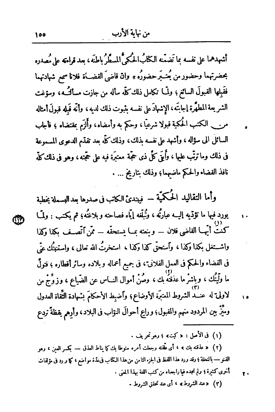 - فيبتدئ الكاتب فى صدرها بعد البسملة بخطبة يورد فيها ما تؤدّيه إليه عبارته، وتبلّغه إيّاه فصاحته وبلاغته؛ ثم يكتب: ولمّا كنت «1» أيّها القاضى فلان- وينعته بما يستحقّه- ممّن اتّصف بكذا وكذا واشتغل بكذا وكذا، واستحقّ كذا وكذا، استخرت الله تعالى، واستنبتك عنّى فى القضاء والحكم فى العمل الفلانىّ، فى جميع أعماله وبلاده وسائر أقطاره؛ فتولّ ما ولّيتك، وباشر ما عذقته «2» بك، وصن أموال الناس عن الضّياع، وزوّج من لا ولىّ له عند «3» الشروط المعتبرة الأوضاع؛ واضبط الأحكام بشهادة الثّقاة العدول وميّز بين المردود منهم والمقبول؛ وراع أحوال النوّاب فى البلاد، وأرهم يقظة تردع