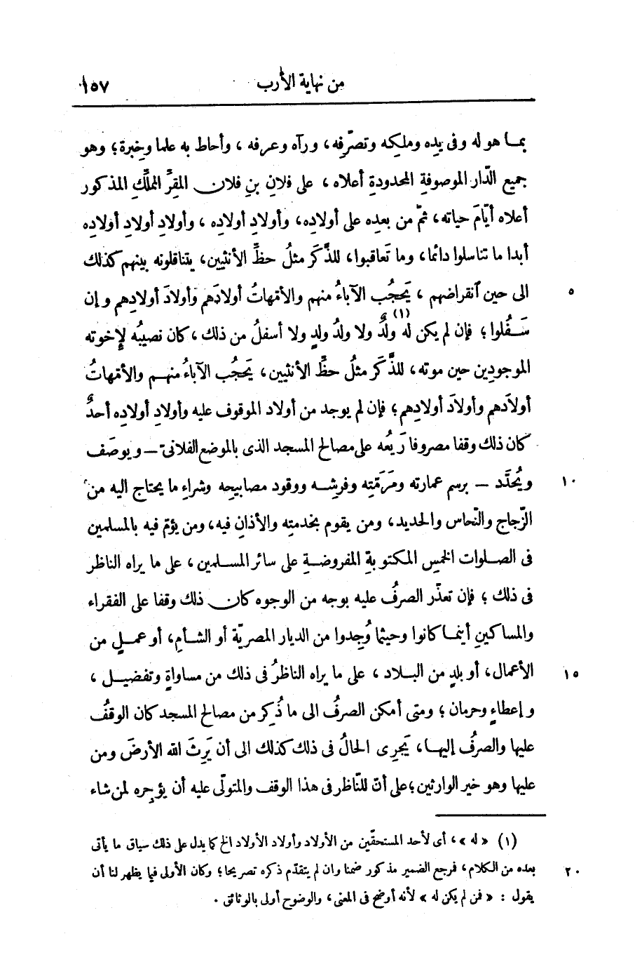 بما هو له وفى يده وملكه وتصرّفه، ورآه وعرفه، وأحاط به علما وخبرة؛ وهو جميع الدّار الموصوفة المحدودة أعلاه، على فلان بن فلان المقرّ المملّك المذكور أعلاه أيّام حياته، ثمّ من بعده على أولاده، وأولاد أولاده، وأولاد أولاد أولاده أبدا ما تناسلوا دائما، وما تعاقبوا، للذّكر مثل حظّ الأنثيين، يتناقلونه بينهم كذلك الى حين انقراضهم، يحجب الآباء منهم والأمّهات أولادهم وأولاد أولادهم وإن سفلوا؛ فإن لم يكن له «1» ولد ولا ولد ولد ولا أسفل من ذلك، كان نصيبه لإخوته الموجودين حين موته، للذّكر مثل حظّ الأنثيين، يحجب الآباء منهم والأمّهات أولادهم وأولاد أولادهم؛ فإن لم يوجد من أولاد الموقوف عليه وأولاد أولاده أحد كان ذلك وقفا مصروفا ريعه على مصالح المسجد الذى بالموضع الفلانىّ- ويوصف ويحدّد- برسم عمارته ومرمّته وفرشه ووقود مصابيحه وشراء ما يحتاج اليه من الزّجاج والنّحاس والحديد، ومن يقوم بخدمته والأذان فيه، ومن يؤمّ فيه بالمسلمين فى الصلوات الخمس المكتوبة المفروضة على سائر المسلمين، على ما يراه الناظر فى ذلك؛ فإن تعذّر الصرف عليه بوجه من الوجوه كان ذلك وقفا على الفقراء والمساكين أينما كانوا وحيثما وجدوا من الديار المصريّة أو الشأم، أو عمل من الأعمال، أو بلد من البلاد، على ما يراه الناظر فى ذلك من مساواة وتفضيل، وإعطاء وحرمان؛ ومتى أمكن الصرف الى ما ذكر من مصالح المسجد كان الوقف عليها والصرف إليها، يجرى الحال فى ذلك كذلك الى أن يرث الله الأرض ومن عليها وهو خير الوارثين؛ على أنّ للنّاظر فى هذا الوقف والمتولّى عليه أن يؤجره لمن شاء