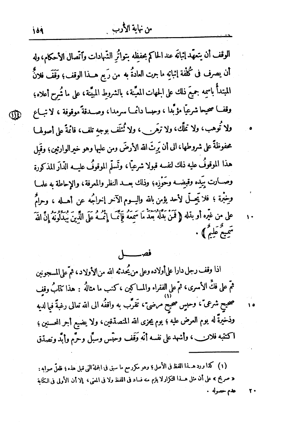 الوقف أن يتعهّد إثباته عند الحاكم بحفظه بتواتر الشّهادات واتّصال الأحكام، وله أن يصرف فى كلفة إثباته ما جرت العادة به من ريع هذا الوقف؛ وقف فلان المبتدأ باسمه جميع ذلك على الجهات المعيّنة، بالشروط المبيّنة، على ما شرح أعلاه؛ وقفا صحيحا شرعيّا مؤبّدا، وحبسا دائما سرمدا، وصدقة موقوفة، لاتباع ولا توهب، ولا تملّك، ولا ترهن، ولا تتلف بوجه تلف، قائمة على أصولها محفوظة على شروطها، الى أن يرث الله الأرض ومن عليها وهو خير الوارثين؛ وقبل هذا الموقوف عليه ذلك لنفسه قبولا شرعيّا، وتسلّم الموقوف عليه الدّار المذكورة وصارت بيده وقبضه وحوزه؛ وذلك بعد النظر والمعرفة، والإحاطة به علما وخبرة؛ فلا يحلّ لأحد يؤمن بالله واليوم الآخر إخراجه عن أهله، وحرام على من غيّره أو بدّله (فَمَنْ بَدَّلَهُ بَعْدَ ما سَمِعَهُ فَإِنَّما إِثْمُهُ عَلَى الَّذِينَ يُبَدِّلُونَهُ إِنَّ اللَّهَ سَمِيعٌ عَلِيمٌ) .