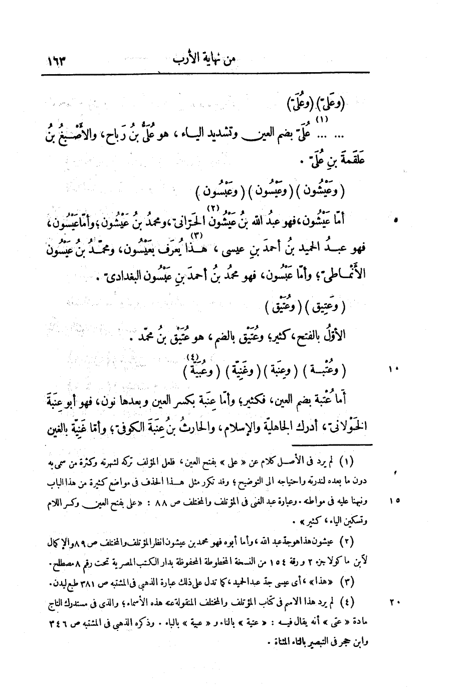 (وعيشون) (وعيسون) (وعبسون) أمّا عيشون، فهو عبد الله بن عيشون «2» الحرّانىّ، ومحمد بن عيشون؛ وأمّا عيسون، فهو عبد الحميد بن أحمد بن عيسى، هذا «3» يعرف بعيسون، ومحمّد بن عيسون الأنماطىّ؛ وأمّا عبسون، فهو محمد بن أحمد بن عبسون البغدادىّ.