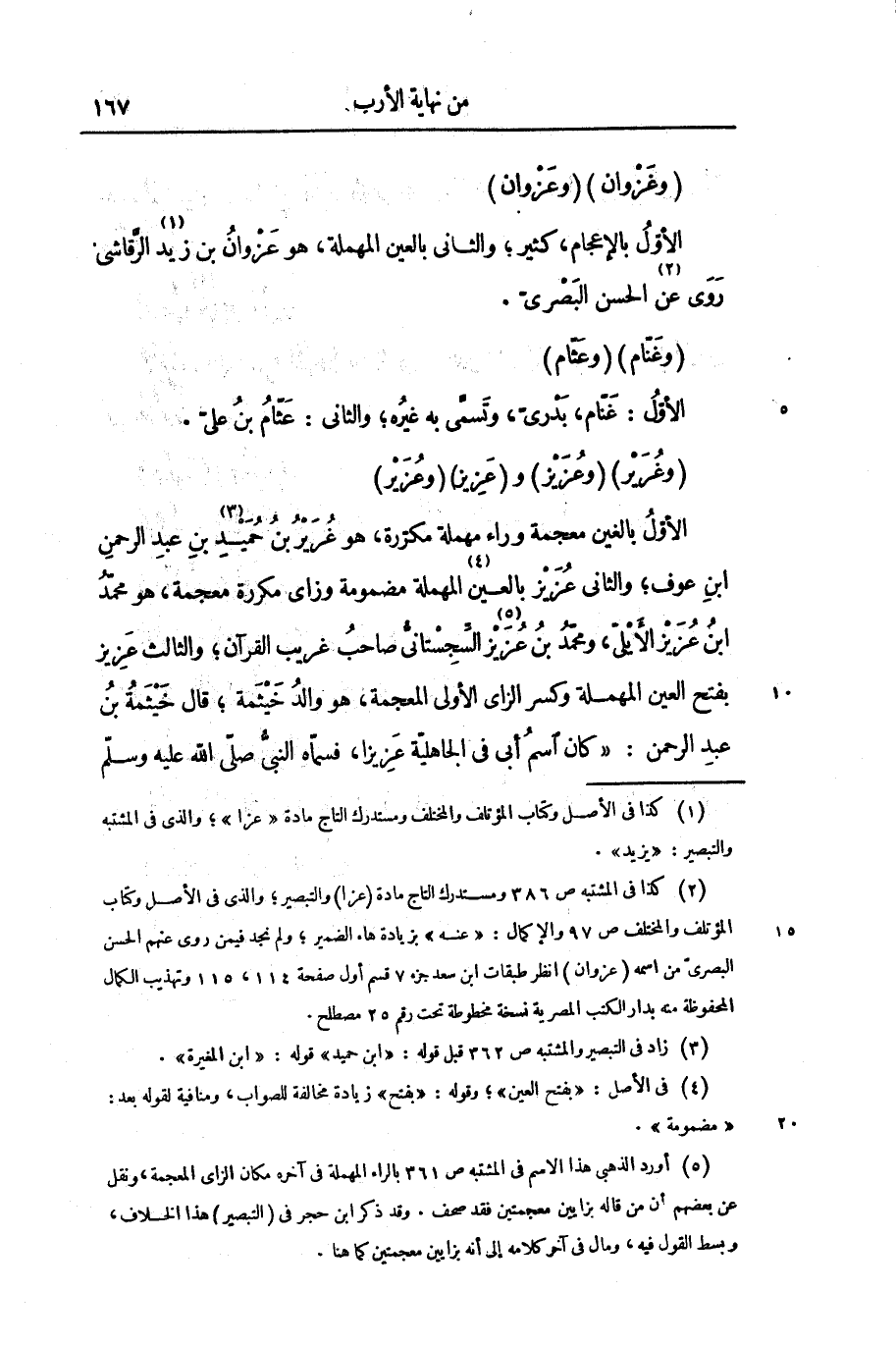 (وغرير) (وعزيز) و (عزيز) (وعزير) الأوّل بالغين معجمة وراء مهملة مكرّرة، هو غرير بن حميد «3» بن عبد الرحمن ابن عوف؛ والثانى عزيز بالعين «4» المهملة مضمومة وزاى مكررة معجمة، هو محمّد ابن عزيز الأيلىّ، ومحمّد بن عزيز «5» السّجستانىّ صاحب غريب القرآن؛ والثالث عزيز بفتح العين المهملة وكسر الزاى الأولى المعجمة، هو والد خيثمة؛ قال خيثمة بن عبد الرحمن: «كان اسم أبى فى الجاهليّة عزيزا، فسمّاه النبىّ صلى الله عليه وسلم