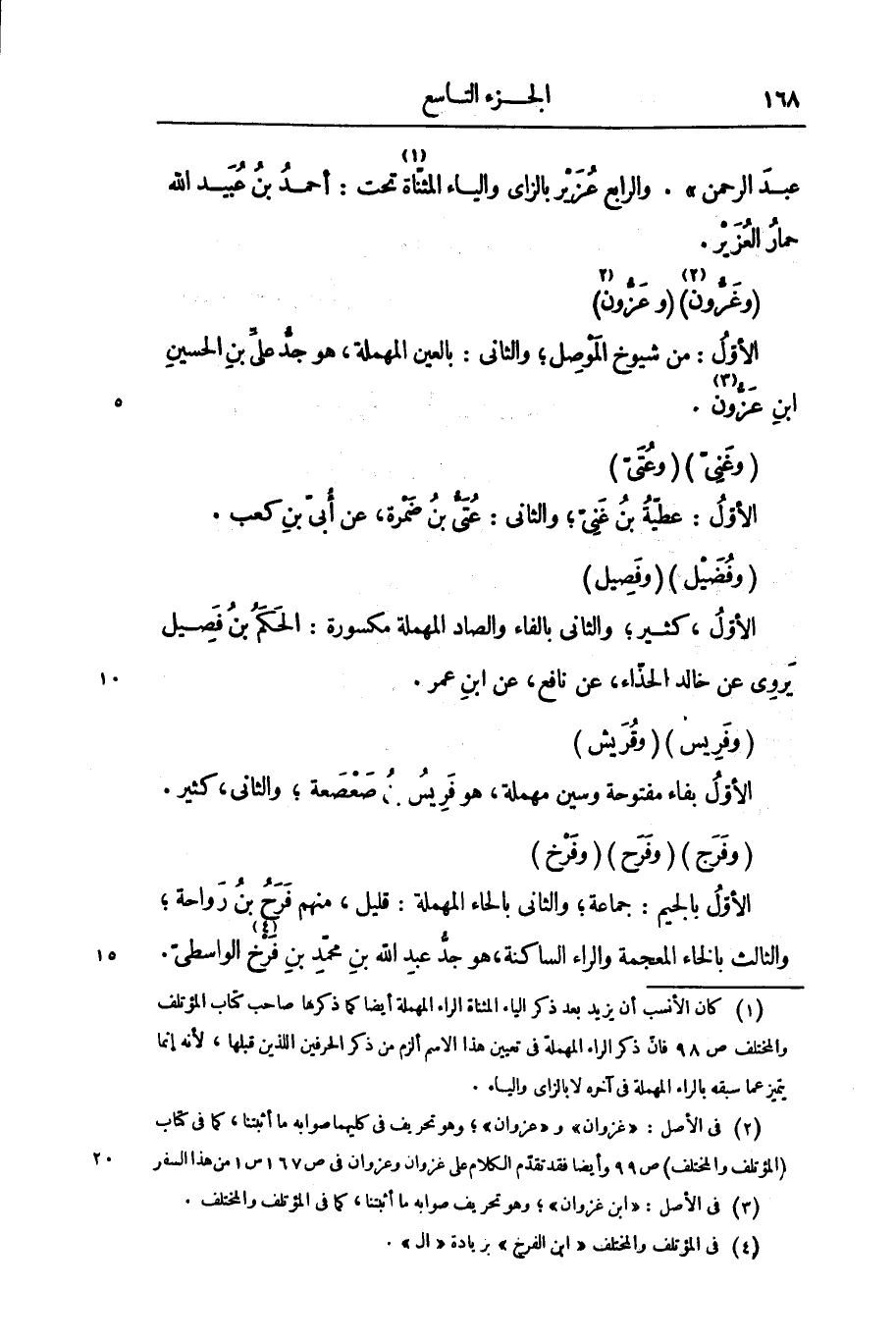 عبد الرحمن» . والرابع عزير بالزاى والياء المثنّاة «1» تحت: أحمد بن عبيد الله حمار العزير.