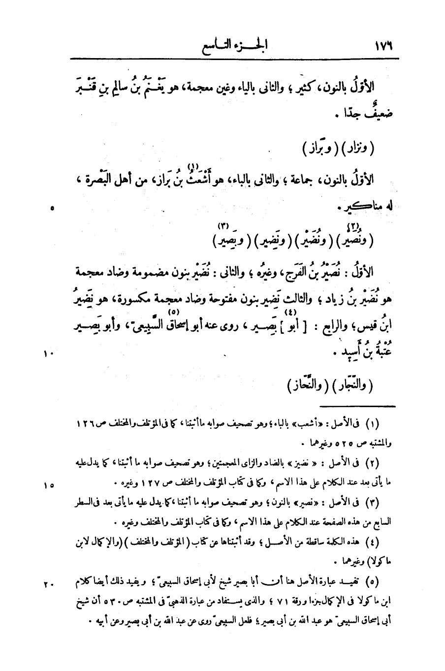 (ونصير «2» ) (ونضير) (ونضير) (وبصير «3» ) الأوّل: نصير بن الفرج، وغيره؛ والثانى: نضير بنون مضمومة وضاد معجمة هو نضير بن زياد؛ والثالث نضير بنون مفتوحة وضاد معجمة مكسورة، هو نضير ابن قيس؛ والرابع: [أبو «4» ] بصير، روى عنه أبو إسحاق «5» السّبيعىّ، وأبو بصير عتبة بن أسيد.