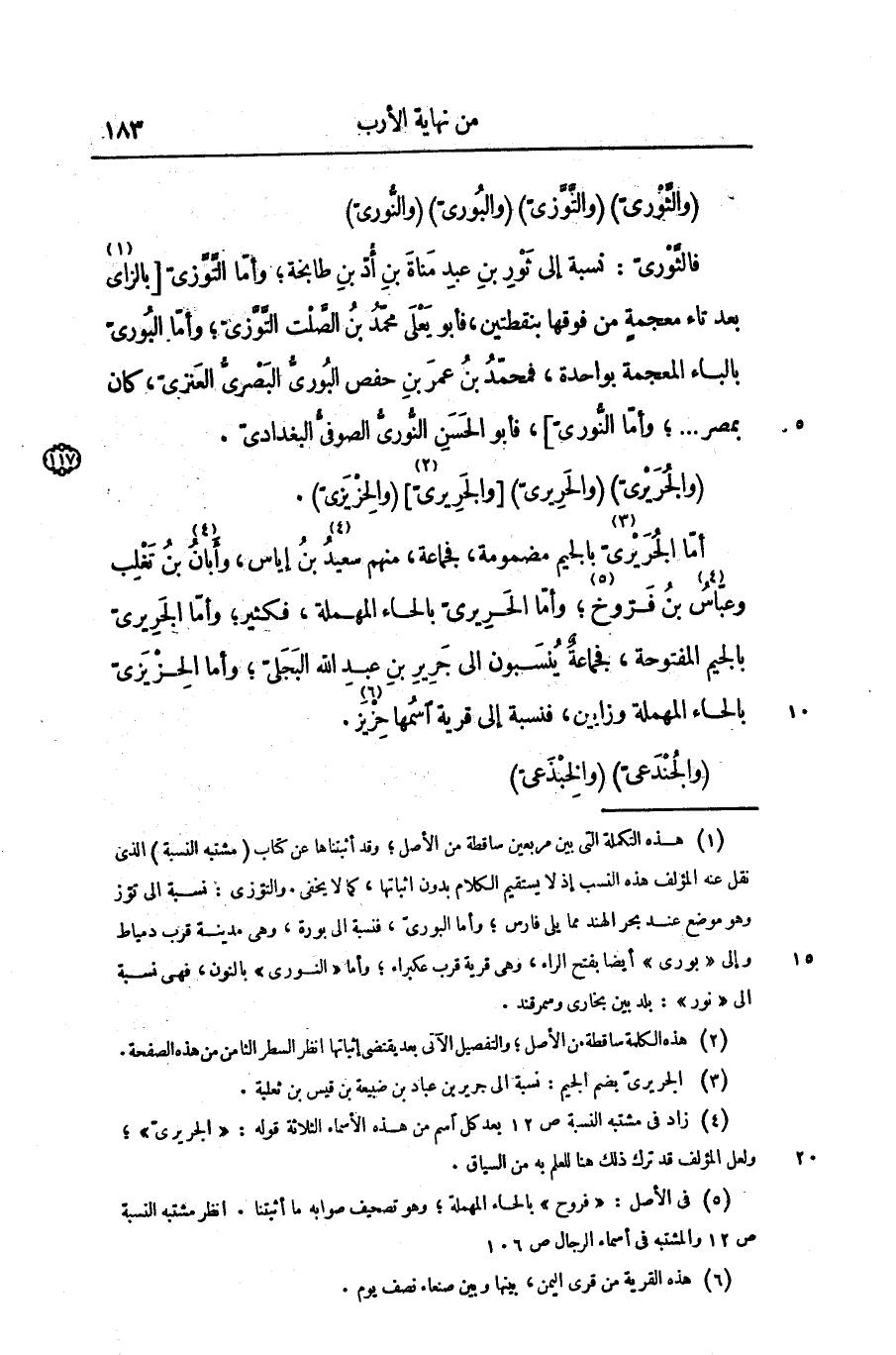 (والثّورىّ) (والتّوّزىّ) (والبورىّ) (والنّورىّ) فالثّورىّ: نسبة إلى ثور بن عبد مناة بن أدّ بن طابخة؛ وأمّا التّوّزىّ [بالزاى «1» بعد تاء معجمة من فوقها بنقطتين، فأبو يعلى محمّد بن الصّلت التّوّزىّ؛ وأمّا البورىّ بالباء المعجمة بواحدة، فمحمّد بن عمر بن حفص البورىّ البصرىّ العنزىّ، كان بمصر ... ؛ وأمّا النّورىّ] ، فأبو الحسن النّورىّ الصوفىّ البغدادىّ.