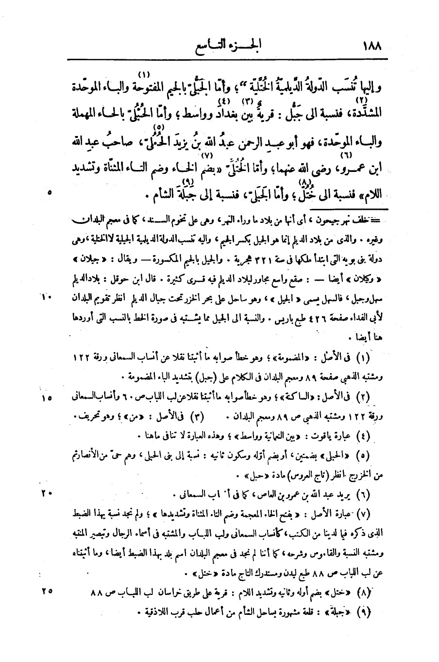 وإليها تنسب الدّولة الدّيلميّة الختّليّة» ؛ وأمّا الجبّلىّ بالجيم المفتوحة «1» والباء الموحّدة المشدّدة «2» ، فنسبة الى جبّل: قرية بين «3» بغداد «4» وواسط؛ وأمّا الحبلىّ بالحاء المهملة والباء الموحّدة، فهو أبو عبد الرحمن عبد الله بن يزيد الحملىّ «5» ، صاحب عبد الله ابن عمرو «6» ، رضى الله عنهما؛ وأمّا الختلّى «بضم «7» الخاء وضم التاء المثنّاة وتشديد اللام» فنسبة الى ختلّ «8» ؛ وأمّا الجبلىّ، فنسبة إلى جبلة «9» الشأم.