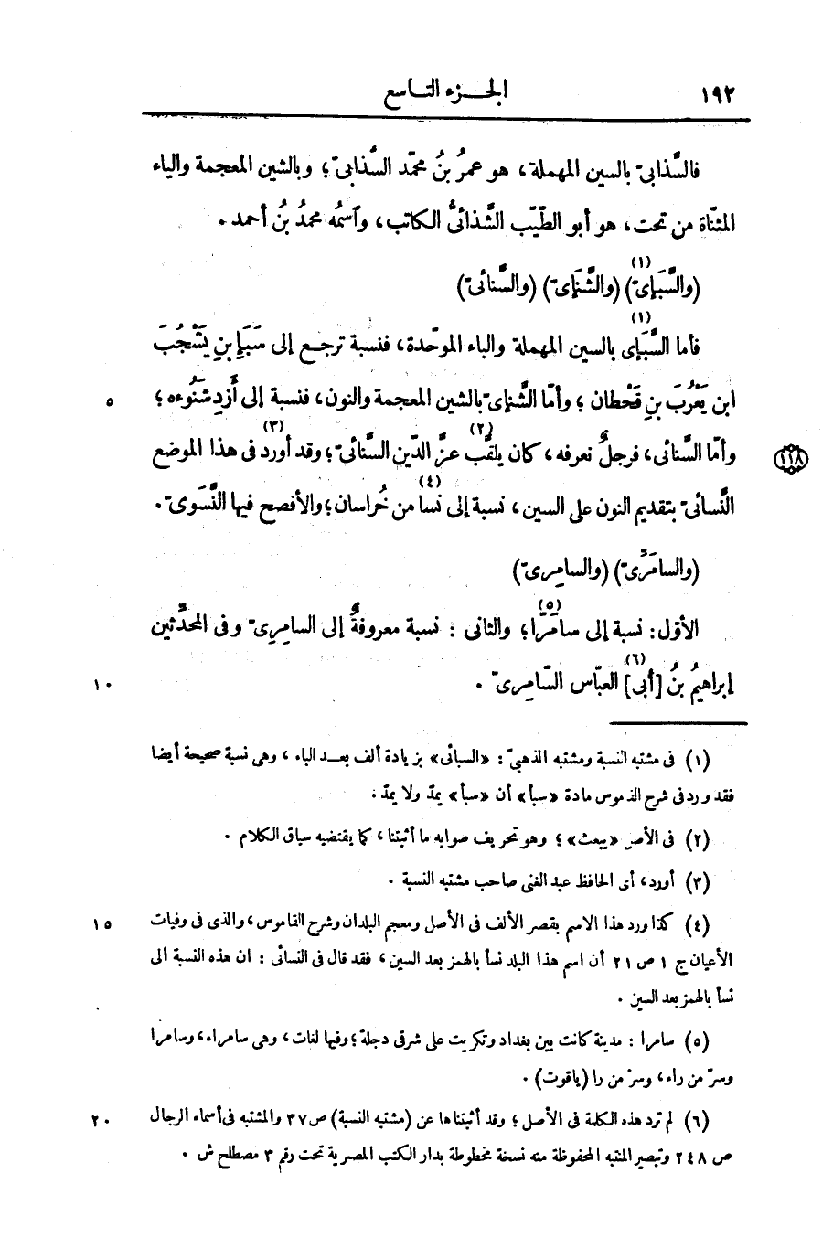 (والسامرّىّ) (والسامرىّ) الأوّل: نسبة إلى سامرّا «6» ؛ والثانى: نسبة معروفة إلى السامرىّ وفى المحدّثين إبراهيم بن [أبى «7» ] العبّاس السّامرىّ.