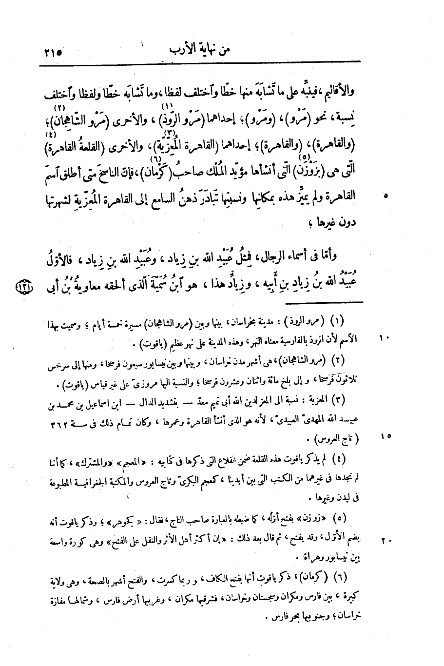 والأقاليم، فينبّه على ما تشابه منها خطّا واختلف لفظا، وما تشابه خطّا ولفظا واختلف نسبة، نحو (مرو) ، (ومرو) ؛ إحداهما (مرو الرّوذ «1» ) ، والأخرى (مرو الشّاهجان «2» ) ؛ (والقاهرة) ، (والقاهرة) ؛ إحداهما (القاهرة المعزّيّة «3» ) ، والأخرى (القلعة القاهرة «4» ) التى هى (بزوزن «5» ) التى أنشأها مؤيّد الملك صاحب (كرمان «6» ) ، فإنّ الناسخ متى أطلق اسم القاهرة ولم يميّز هذه بمكانها ونسبتها تبادر ذهن السامع إلى القاهرة المعزّية لشهرتها دون غيرها؛ وأمّا فى أسماء الرجال، فمثل عبيد الله بن زياد، وعبيد الله بن زياد، فالأوّل عبيد الله بن زياد بن أبيه، وزياد هذا، هو ابن سميّة الذى ألحقه معاوية بن أبى
