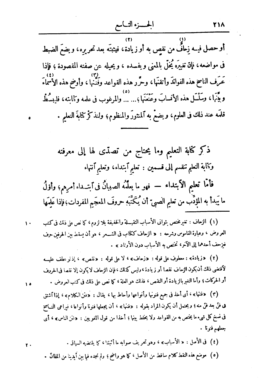 أو حصل فيه زحاف «1» من نقص به أو زيادة «2» ، فيثبته بعد تحريره، ويضع الضبط فى مواضعه، فإنّ تغييره يخلّ بالمعنى ويفسده، ويحيله عن صفته المقصودة؛ فإذا عرف الناسخ هذه الفوائد وأتقنها، وحرّر هذه القواعد وفنّنها «3» ، وأوضح هذه الأسماء «4» وبيّنها، وسلسل هذه الأنساب وعنعنها؛ ... «5» ... والمرغوب فى علمه وكتابته، فليبسط قلمه عند ذلك فى العلوم، ويضع به المنثور والمنظوم؛ ولنذكر كتابة التعليم.