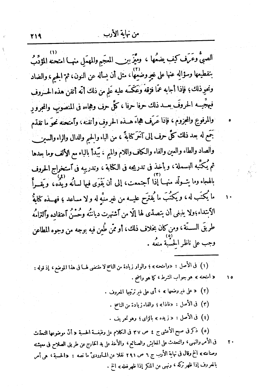 الصبىّ وعرف كيف يضعها، وميّز بين المعجم والمهمل منها امتحنه «1» المؤدّب بتقطيعها وسؤاله عنها على غير وضعها «2» ، مثل أن يسأله عن النون، ثمّ الجيم، والضاد ونحو ذلك؛ فإذا أجابه عمّا فرّقه وعكسه عليه علم من ذلك أنّه أتقن هذه الحروف فيهجّيه الحروف بعد ذلك حرفا حرفا، كلّ حرف وهجاءه فى المنصوب والمجرور والمرفوع والمجزوم، فإذا عرف هجاء هذه الحروف وأتقنه، وامتحنه نحو ما تقدّم جمع له بعد ذلك كلّ حرف إلى آخر كتابة، من الباء والجيم والدال والراء والسين والصاد والطاء والعين والفاء والكاف واللام والميم، يبدأ بالباء مع الألف وما بعدها ثم يكتّبه البسملة، ويأخذ فى تدريجه فى الكتابة، وتدريبه فى استخراج الحروف بالهجاء وما يتولّد منها إذا «3» اجتمعت، إلى أن يقوى فيها لسانه ويده «4» ، ويقرأ ما يكتب له، ويكتب ما يقترح عليه من غير منبّه له ولا مساعد؛ فهذه كتابة الابتداء؛ ولا ينبغى أن يتصدّى لها إلّا من اشتهرت ديانته وحسن اعتقاده والتزامه طريق السنّة، ومن كان بخلاف ذلك، أو ممّن طعن فيه بوجه من وجوه المطاعن وجب على ناظر الحسبة «5» منعه.
