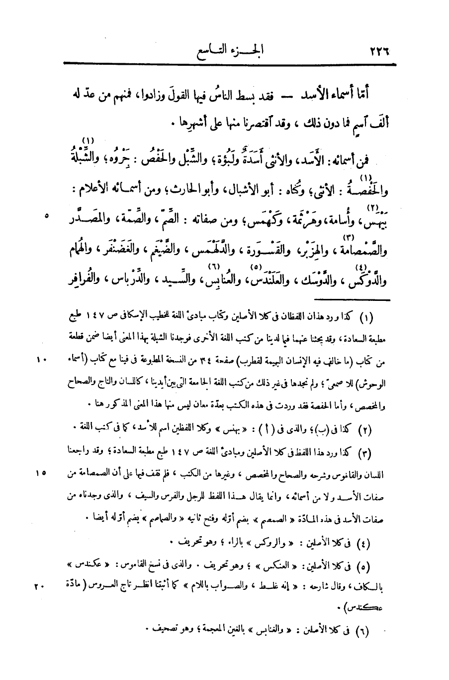 بيهس «3» ، وأسامة، وهرثمة، وكهمس؛ ومن صفاته: الصّمّ، والصّمّة، والمصدّر والصّمصامة «4» ، والهزبر، والقسورة، والدّلهمس، والضّيغم، والغضنفر، والهمام والدّوكس «5» ، والدّوسك، والعلندس «6» ، والعنابس «7» ، والسّيد، والدّرباس، والفرافر