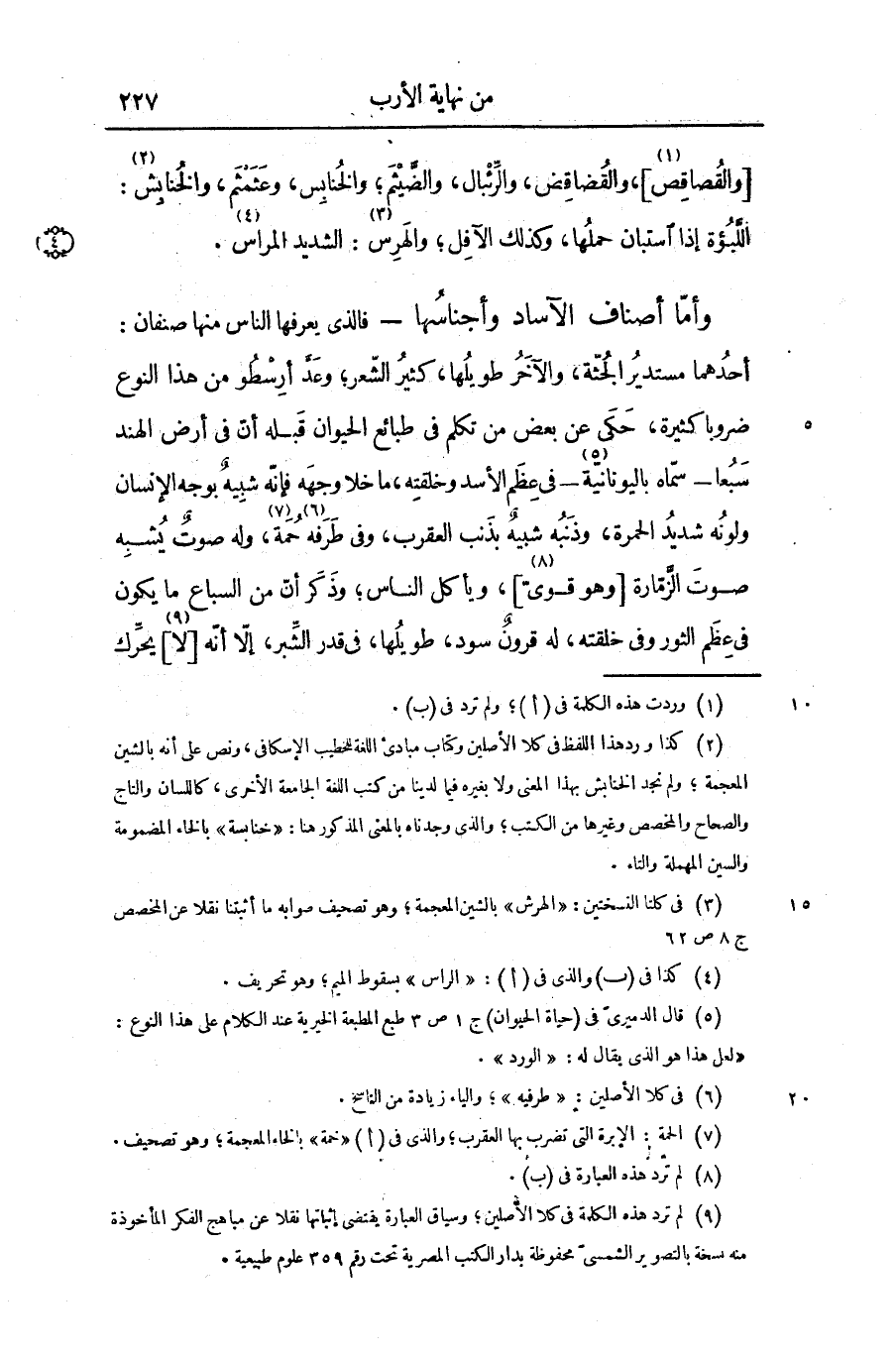 أحدهما مستدير الجثّة، والآخر طويلها، كثير الشّعر؛ وعدّ أرسطو من هذا النوع ضروبا كثيرة، حكى عن بعض من تكلم فى طبائع الحيوان قبله أنّ فى أرض الهند سبعا- سمّاه باليونانيّة «5» - فى عظم الأسد وخلقته، ما خلا وجهه فإنّه شبيه بوجه الإنسان ولونه شديد الحمرة، وذنبه شبيه بذنب العقرب، وفى طرفه «6» حمة «7» ، وله صوت يشبه صوت الزّمّارة [وهو قوىّ «8» ] ، ويأكل الناس؛ وذكر أنّ من السباع ما يكون فى عظم الثور وفى خلقته، له قرون سود، طويلها، فى قدر الشّبر، إلّا أنّه [لا «9» ] يحرّك