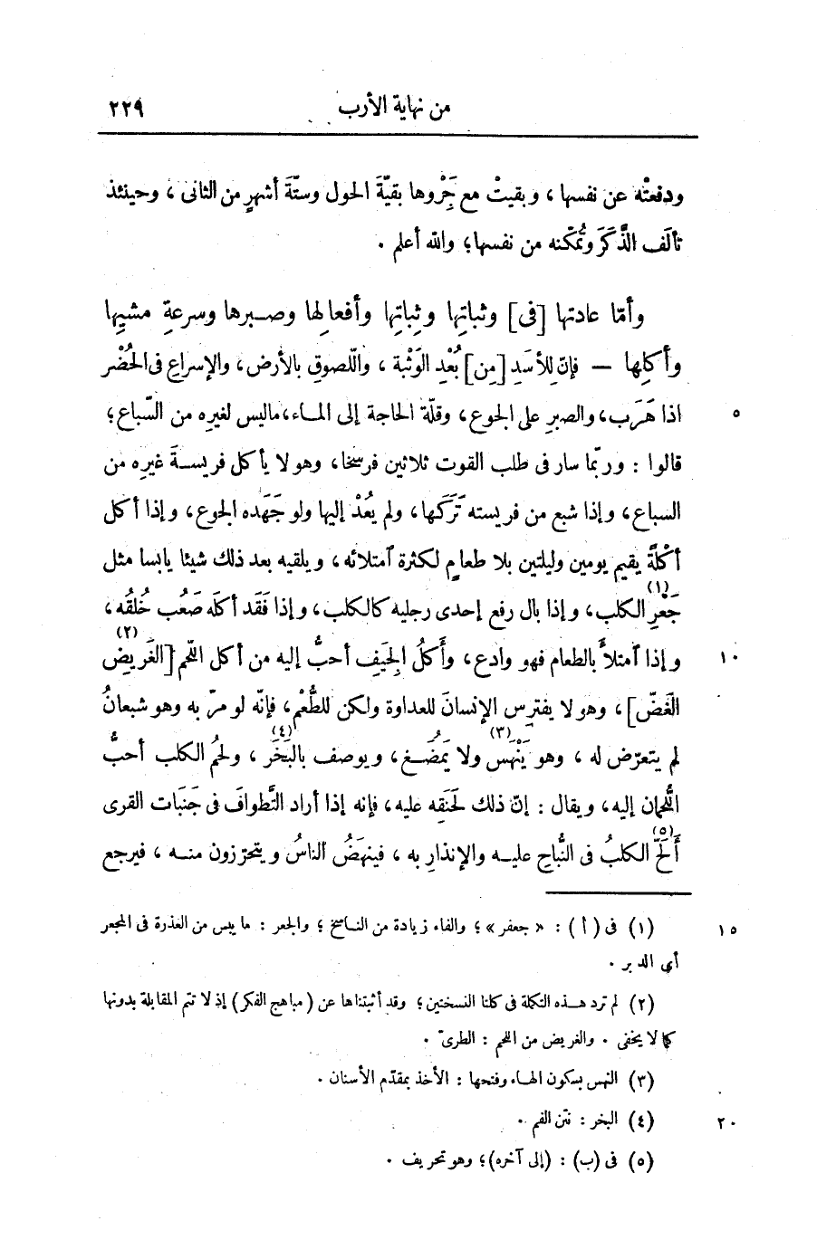 - فإنّ للأسد [من] بعد الوثبة، واللّصوق بالأرض، والإسراع فى الحضر اذا هرب، والصبر على الجوع، وقلّة الحاجة إلى الماء، ما ليس لغيره من السّباع؛ قالوا: وربّما سار فى طلب القوت ثلاثين فرسخا، وهو لا يأكل فريسة غيره من السباع، وإذا شبع من فريسته تركها، ولم يعد إليها ولو جهده الجوع، وإذا أكل أكلة يقيم يومين وليلتين بلا طعام لكثرة امتلائه، ويلقيه بعد ذلك شيئا يابسا مثل جعر «1» الكلب، وإذا بال رفع إحدى رجليه كالكلب، وإذا فقد أكله صعب خلقه، وإذا امتلأ بالطعام فهو وادع، وأكل الجيف أحبّ إليه من أكل اللّحم [الغريض «2» الغضّ] ، وهو لا يفترس الإنسان للعداوة ولكن للطّعم، فإنّه لو مرّ به وهو شعبان لم يتعرّض له، وهو ينهس «3» ولا يمضغ، ويوصف بالبخر «4» ، ولحم الكلب أحبّ اللّحمان إليه، ويقال: إنّ ذلك لحنقه عليه، فإنه إذا أراد التّطواف فى جنبات القرى ألحّ «5» الكلب فى النّباح عليه والإنذار به، فينهض الناس ويتحرّزون منه، فيرجع