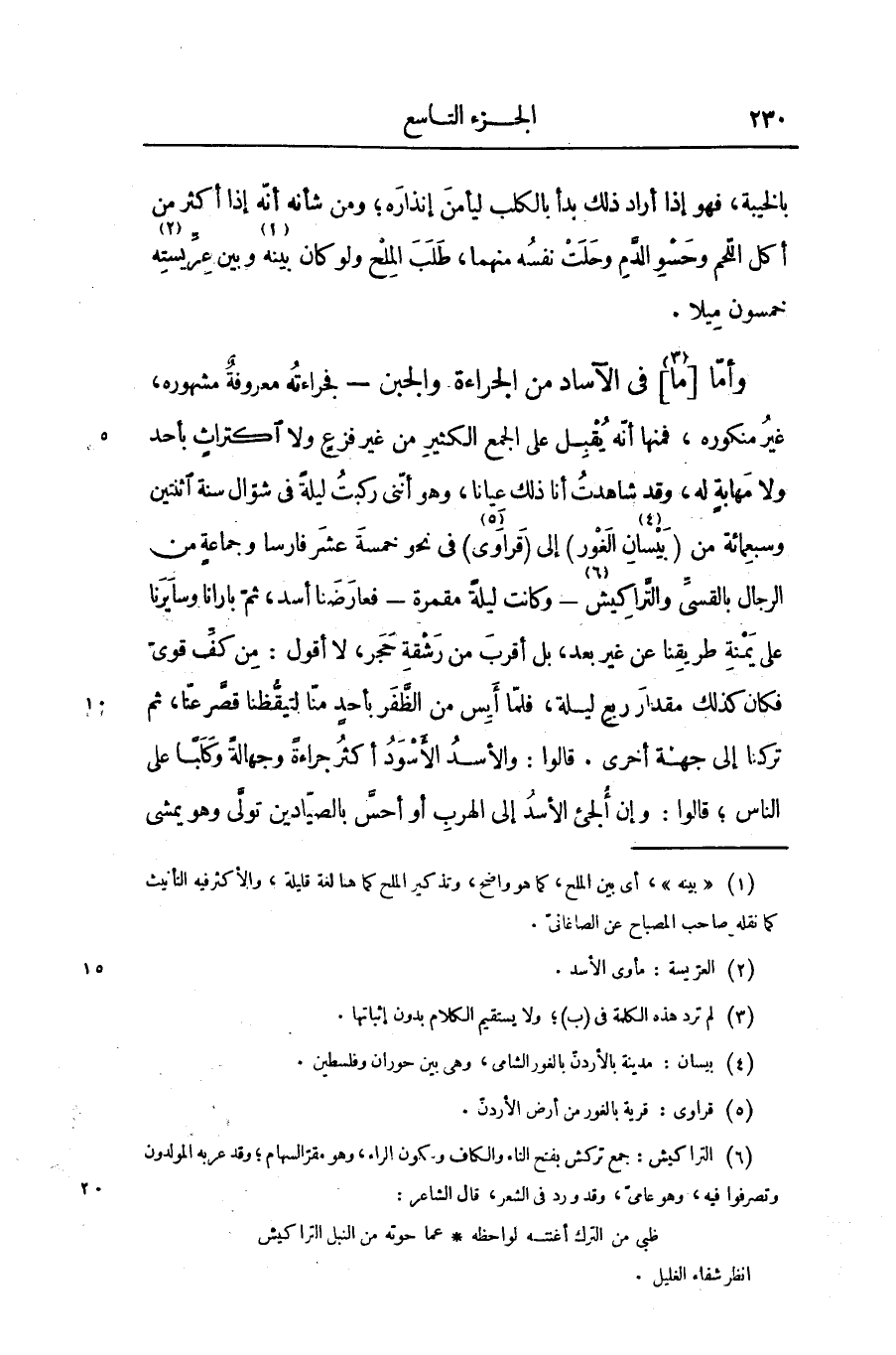غير منكوره، فمنها أنّه يقبل على الجمع الكثير من غير فزع ولا اكتراث بأحد ولا مهابة له، وقد شاهدت أنا ذلك عيانا، وهو أنّنى ركبت ليلة فى شوّال سنة اثنتين وسبعمائة من (بيسان «4» الغور) إلى (قراوى «5» ) فى نحو خمسة عشر فارسا وجماعة من الرجال بالقسىّ والتّراكيش «6» - وكانت ليلة مقمرة- فعارضنا أسد، ثمّ بارانا وسايرنا على يمنة طريقنا عن غير بعد، بل أقرب من رشقة حجر، لا أقول: من كفّ قوىّ فكان كذلك مقدار ربع ليلة، فلمّا أيس من الظّفر بأحد منّا لتيقّظنا قصّر عنّا، ثم تركنا إلى جهة أخرى. قالوا: والأسد الأسود أكثر جراءة وجهالة وكلبا على الناس؛ قالوا: وإن ألجئ الأسد إلى الهرب أو أحسّ بالصيّادين تولّى وهو يمشى
