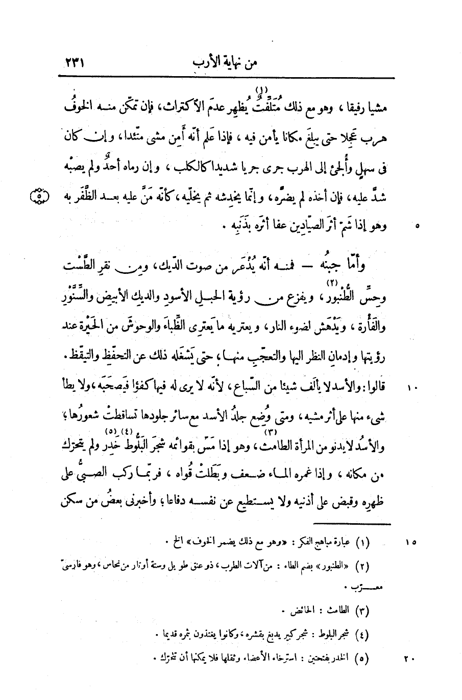 قالوا: والأسد لا يألف شيئا من السّباع، لأنّه لا يرى له فيها كفؤا فيصحبه، ولا يطأ شىء منها على أثر مشيه، ومتى وضع جلد الأسد مع سائر جلودها تساقطت شعورها؛ والأسد لا يدنو من المرأة الطامث «3» ، وهو إذا مسّ بقوائمه شجر البلّوط «4» خدر «5» ولم يتحرّك من مكانه، وإذا غمره الماء ضعف وبطلت قواه، فربّما ركب الصبىّ على ظهره وقبض على أذنيه ولا يستطيع عن نفسه دفاعا؛ وأخبرنى بعض من سكن