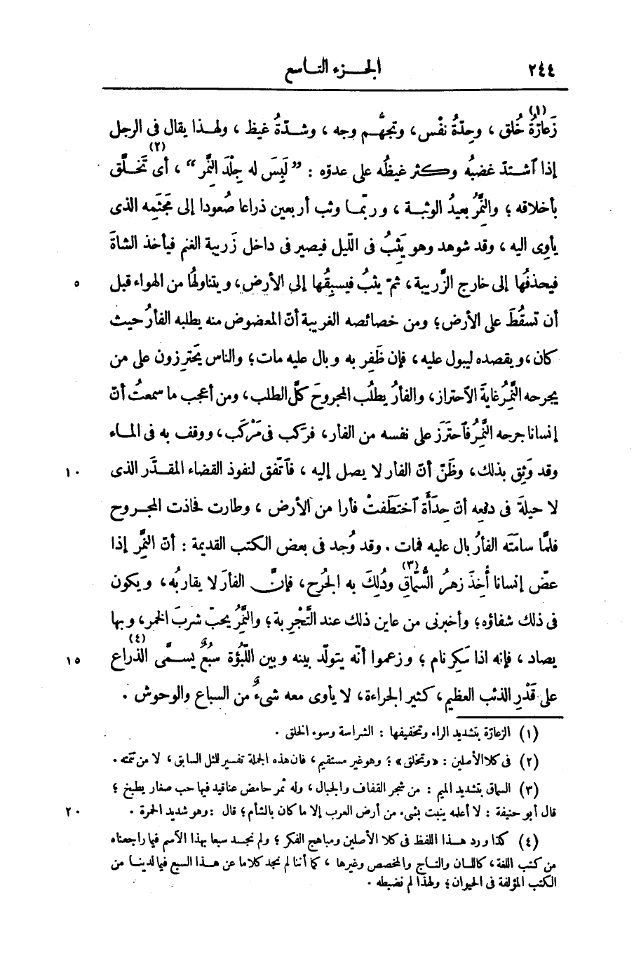 زعارّة «1» خلق، وحدّة نفس، وتجهّم وجه، وشدّة غيظ، ولهذا يقال فى الرجل إذا اشتدّ غضبه وكثر غيظه على عدوّه: «لبس له جلد النّمر» ، أى «2» تخلّق بأخلاقه؛ والنّمر بعيد الوثبة، وربّما وثب أربعين ذراعا صعودا إلى مجثمه الذى يأوى اليه، وقد شوهد وهو يثب فى اللّيل فيصير فى داخل زريبة الغنم فيأخذ الشاة فيحذفها إلى خارج الزّريبة، ثمّ يثب فيسبقها إلى الأرض، ويتناولها من الهواء قبل أن تسقط على الأرض؛ ومن خصائصه الغريبة أنّ المعضوض منه يطلبه الفأر حيث كان، ويقصده ليبول عليه، فإن ظفر به وبال عليه مات؛ والناس يحترزون على من يجرحه النّمر غاية الاحتراز، والفأر يطلب المجروح كلّ الطلب، ومن أعجب ما سمعت أنّ إنسانا جرحه النّمر فاحترز على نفسه من الفأر، فركب فى مركب، ووقف به فى الماء وقد وثق بذلك، وظنّ أنّ الفأر لا يصل إليه، فاتّفق لنفوذ القضاء المقدّر الذى لا حيلة فى دفعه أنّ حدأة اختطفت فأرا من الأرض، وطارت فخاذت المجروح فلمّا سامته الفأر بال عليه فمات. وقد وجد فى بعض الكتب القديمة: أنّ النّمر إذا عضّ إنسانا أخذ زهر السّمّاق «3» ودلك به الجرح، فإنّ الفأر لا يقاربه، ويكون فى ذلك شفاؤه؛ وأخبرنى من عاين ذلك عند التّجربة؛ والنّمر يحبّ شرب الخمر، وبها يصاد، فإنه اذا سكر نام؛ وزعموا أنّه يتولّد بينه وبين اللّبؤة سبع يسمّى الذراع «4» على قدر الذئب العظيم، كثير الجراءة، لا يأوى معه شىء من السباع والوحوش.