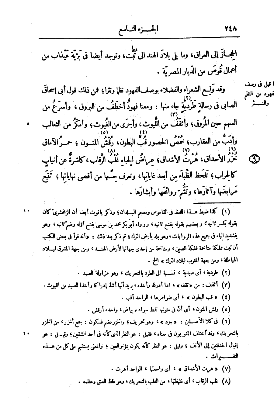 وقد ولع الشعراء والفضلاء بوصف الفهود نظما ونثرا؛ فمن ذلك قول أبى إسحاق الصابى فى رسالة طرديّة «2» جاء منها: ومعنا فهود أخطف من البروق، وأسرع من السهم حين المروق؛ وأثقف «3» من اللّيوث، وأجرى من الغيوث؛ وأمكر من الثعالب وأدبّ من العقارب؛ خمص الخصور قبّ «4» البطون، رقش «5» المتون؛ حمر الآماق خزر «6» الأحداق، هرت «7» الأشداق؛ عراض الجباه غلب «8» الرّقاب، كاشرة عن أنياب كالحراب؛ تلحظ الظّباء من أبعد غاياتها، وتعرف حسّها من أقصى نهاياتها؛ تتبع مرابضها وآثارها، وتشمّ روائحها وأبشارها.
