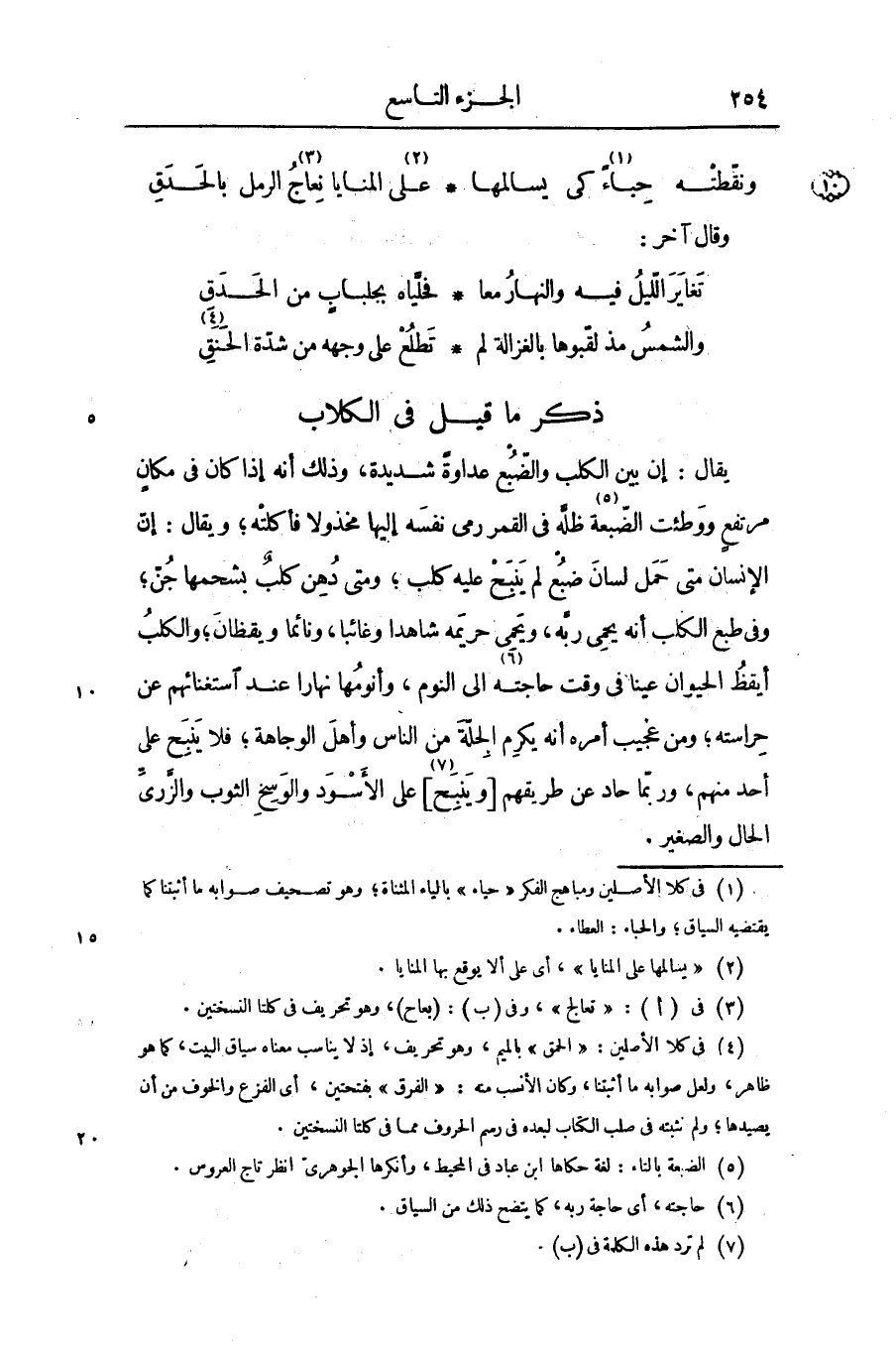 يقال: إن بين الكلب والضّبع عداوة شديدة، وذلك أنه إذا كان فى مكان مرتفع ووطئت الضّبعة «5» ظلّه فى القمر رمى نفسه إليها مخذولا فأكلته؛ ويقال: إنّ الإنسان متى حمل لسان ضبع لم ينبح عليه كلب؛ ومتى دهن كلب بشحمها جنّ؛ وفى طبع الكلب أنه يحمى ربّه، ويحمى حريمه شاهدا وغائبا، ونائما ويقظان؛ والكلب أيقظ الحيوان عينا فى وقت حاجته «6» الى النوم، وأنومها نهارا عند استغنائهم عن حراسته؛ ومن عجيب أمره أنه يكرم الجلّة من الناس وأهل الوجاهة؛ فلا ينبح على أحد منهم، وربّما حاد عن طريقهم [وينبح «7» ] على الأسود والوسخ الثوب والزّرىّ الحال والصغير.