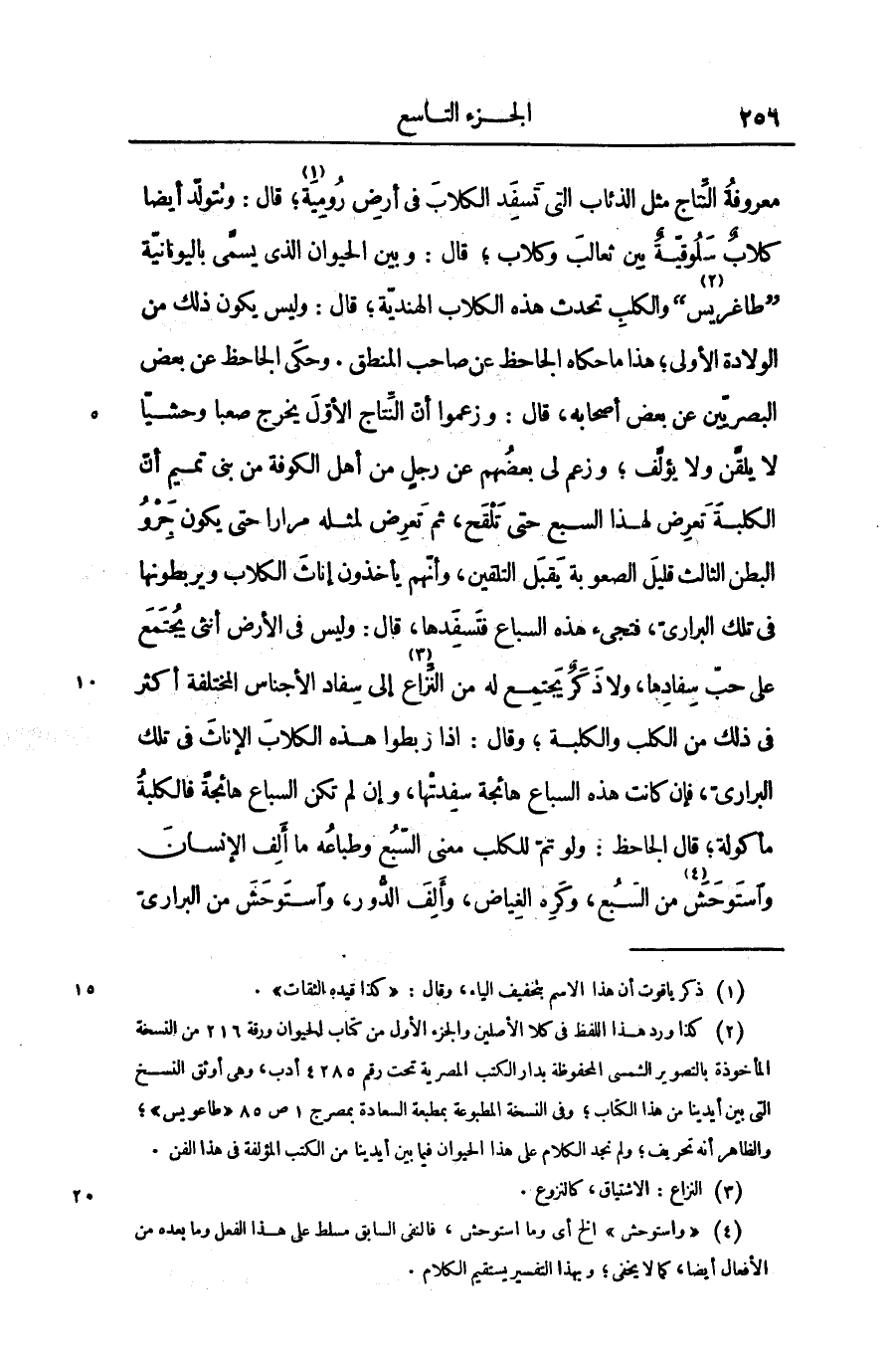 معروفة النّتاج مثل الذئاب التى تسفد الكلاب فى أرض رومية «1» ؛ قال: وتتولّد أيضا كلاب سلوقيّة بين ثعالب وكلاب؛ قال: وبين الحيوان الذى يسمّى باليونانيّة «طاغريس «2» » والكلب تحدث هذه الكلاب الهنديّة؛ قال: وليس يكون ذلك من الولادة الأولى؛ هذا ما حكاه الجاحظ عن صاحب المنطق. وحكى الجاحظ عن بعض البصريّين عن بعض أصحابه، قال: وزعموا أنّ النّتاج الأوّل يخرج صعبا وحشيّا لا يلقّن ولا يؤلّف؛ وزعم لى بعضهم عن رجل من أهل الكوفة من بنى تميم أنّ الكلبة تعرض لهذا السبع حتى تلقح، ثم تعرض لمثله مرارا حتى يكون جرو البطن الثالث قليل الصعوبة يقبل التلقين، وأنّهم يأخذون إناث الكلاب ويربطونها فى تلك البرارىّ، فتجىء هذه السباع فتسفدها، قال: وليس فى الأرض أنثى يجتمع على حبّ سفادها، ولا ذكر يجتمع له من النّزاع «3» إلى سفاد الأجناس المختلفة أكثر فى ذلك من الكلب والكلبة؛ وقال: اذا ربطوا هذه الكلاب الإناث فى تلك البرارىّ، فإن كانت هذه السباع هائجة سفدتها، وإن لم تكن السباع هائجة فالكلبة مأكولة؛ قال الجاحظ: ولو تمّ للكلب معنى السّبع وطباعه ما ألف الإنسان واستوحش «4» من السّبع، وكره الغياض، وألف الدّور، واستوحش من البرارىّ