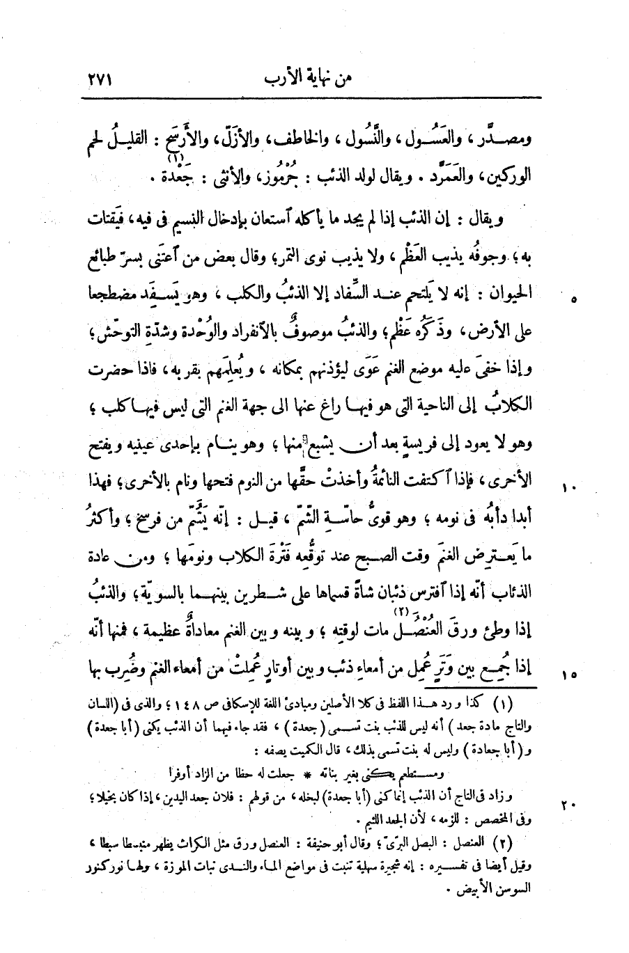 ويقال: إن الذئب إذا لم يجد ما يأكله استعان بإدخال النسيم فى فيه، فيقتات به؛ وجوفه يذيب العظم، ولا يذيب نوى التمر؛ وقال بعض من اعتنى بسرّ طبائع الحيوان: إنه لا يلتحم عند السّفاد إلا الذئب والكلب، وهو يسفد مضطجعا على الأرض، وذكره عظم؛ والذئب موصوف بالانفراد والوحدة وشدّة التوحّش؛ وإذا خفى عليه موضع الغنم عوى ليؤذنهم بمكانه، ويعلمهم بقربه، فاذا حضرت الكلاب إلى الناحية التى هو فيها راغ عنها الى جهة الغنم التى ليس فيها كلب؛ وهو لا يعود إلى فريسة بعد أن يشبع منها؛ وهو ينام بإحدى عينيه ويفتح الأخرى، فإذا اكتفت النائمة وأخذت حقّها من النوم فتحها ونام بالأخرى؛ فهذا أبدا دأبه فى نومه؛ وهو قوىّ حاسّة الشّمّ، قيل: إنّه يشمّ من فرسخ؛ وأكثر ما يعترض الغنم وقت الصبح عند توقّعه فترة الكلاب ونومها؛ ومن عادة الذئاب أنّه إذا افترس ذئبان شاة قسماها على شطرين بينهما بالسويّة؛ والذئب إذا وطئ ورق العنصل «2» مات لوقته؛ وبينه وبين الغنم معاداة عظيمة، فمنها أنّه إذا جمع بين وتر عمل من أمعاء ذئب وبين أوتار عملت من أمعاء الغنم وضرب بها