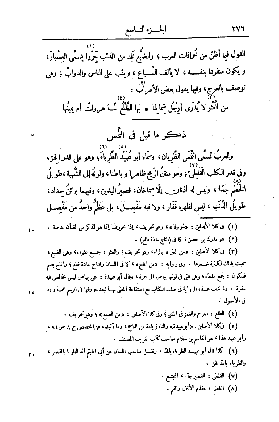 والعرب تسمّى النّمس الظّربان، وسمّاه أبو عبيد «5» الظّرباء «6» ؛ وهو على قدر الهرّ، وفى قدر الكلب القلطىّ «7» ؛ وهو منتن الرّيح ظاهرا وباطنا، ولونه إلى الشّبهة، طويل الخطم «8» جدّا، وليس له أذنان إلّا صماخان، قصير اليدين، وفيهما براثن حداد، طويل الذّنب، ليس لظهره فقار، ولا فيه مفصل، بل عظم واحد من مفصل