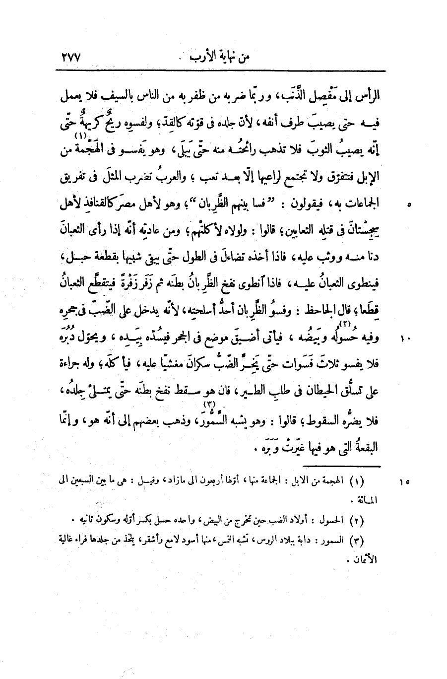 الرأس إلى مفصل الذّنب، وربّما ضربه من ظفر به من الناس بالسيف فلا يعمل فيه حتى يصيب طرف أنفه، لأنّ جلده فى قوّته كالقدّ؛ ولفسوه ريح كريهة حتّى إنّه يصيب الثوب فلا تذهب رائحته منه حتّى يبلى، وهو يفسو فى الهجمة «1» من الإبل فتتفرّق ولا تجتمع لراعيها إلّا بعد تعب؛ والعرب تضرب المثل فى تفريق الجماعات به، فيقولون: «فسا بينهم الظّربان» ؛ وهو لأهل مصر كالقنافذ لأهل سجستان فى قتله الثعابين؛ قالوا: ولو لاه لأكلتهم؛ ومن عادته أنّه إذا رأى الثعبان دنا منه ووثب عليه، فاذا أخذه تضاءل فى الطول حتّى يبقى شبيها بقطعة حبل، فينطوى الثعبان عليه، فاذا انطوى نفخ الظّربان بطنه ثمّ زفر زفرة فيتقطّع الثعبان قطعا؛ قال الجاحظ: وفسو الظّربان أحدّ أسلحته، لأنّه يدخل على الضّبّ فى حجره وفيه حسوله «2» وبيضه، فيأتى أضيق موضع فى الحجر فيسدّه بيده، ويحوّل دبره فلا يفسو ثلاث فسوات حتّى يخرّ الضّبّ سكران مغشيّا عليه، فيأكله؛ وله جراءة على تسلّق الحيطان فى طلب الطير، فان هو سقط نفخ بطنه حتّى يمتلئ جلده، فلا يضرّه السقوط؛ قالوا: وهو يشبه السّمّور «3» ، وذهب بعضهم إلى أنّه هو، وإنّما البقعة التى هو فيها غيّرت وبره.