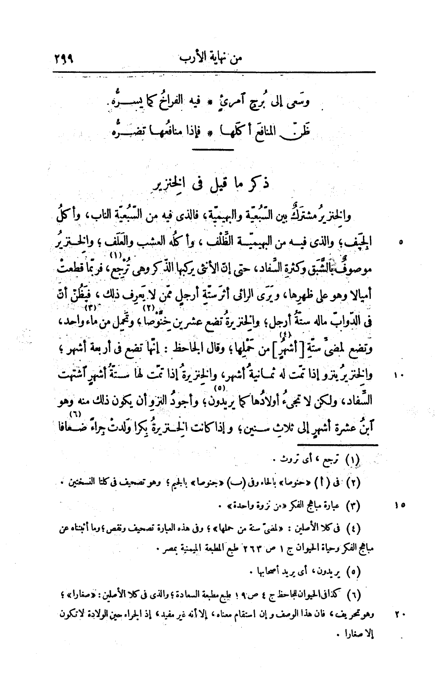 والخنزير مشترك بين السبعيّة والبهيميّة، فالذى فيه من السبعيّة الناب، وأكل الجيف؛ والذى فيه من البهيميّة الظّلف، وأكله العشب والعلف؛ والخنزير موصوف بالشّبق وكثرة السّفاد، حتى إنّ الأنثى يركبها الذّكر وهى ترجع «1» ، فربّما قطعت أميالا وهو على ظهرها، ويرى الرائى أثر ستّة أرجل ممّن لا يعرف ذلك، فيظنّ أنّ فى الدّوابّ ماله ستّة أرجل؛ والخنزيرة تضع عشرين خنّوصا «2» ، وتحمل من ماء «3» واحد، وتضع لمضىّ ستّة [أشهر «4» ] من حملها؛ وقال الجاحظ: إنّها تضع فى أربعة أشهر؛ والخنزير ينز وإذا تمّت له ثمانية أشهر، والخنزيرة إذا تمّت لها ستّة أشهر اشتهت السّفاد، ولكن لا تجىء أولادها كما يريدون «5» ؛ وأجود النزو أن يكون ذلك منه وهو ابن عشرة أشهر إلى ثلاث سنين؛ وإذا كانت الخنزيرة بكرا ولدت جراء ضعافا «6»