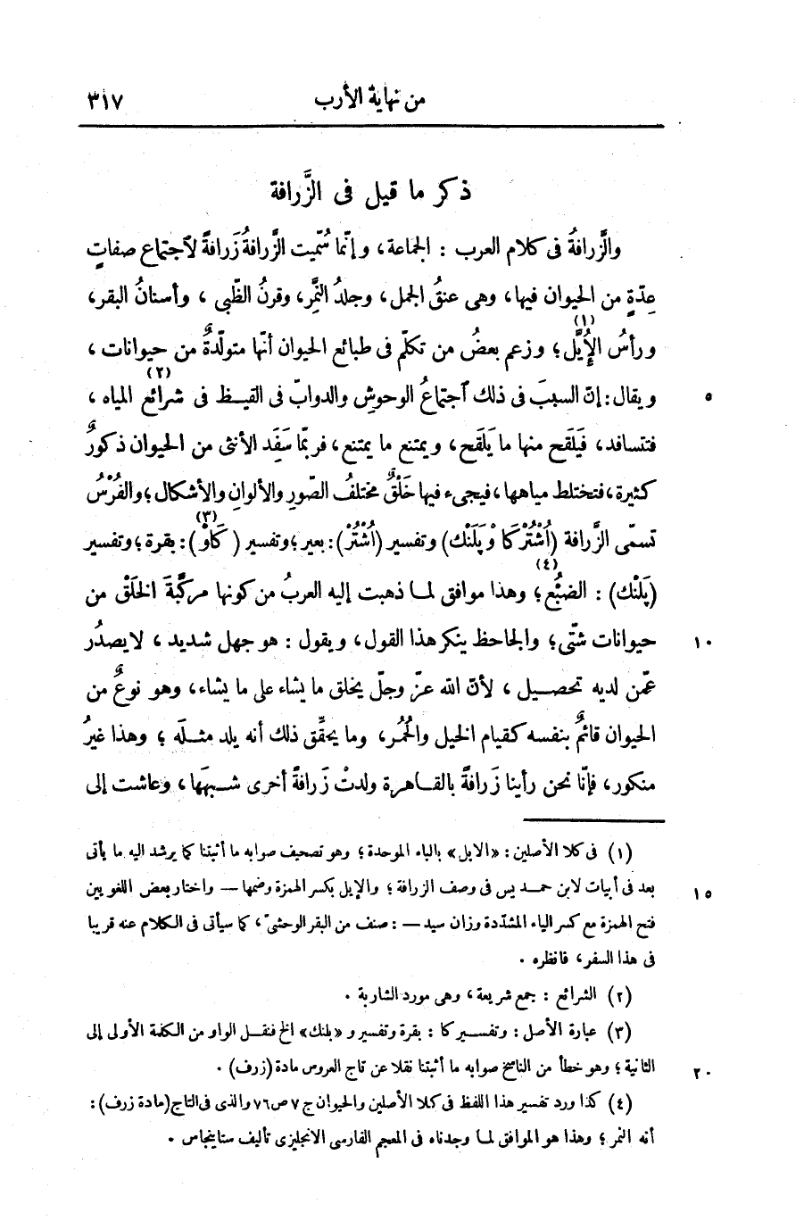 والزّرافة فى كلام العرب: الجماعة، وإنّما سمّيت الزّرافة زرافة لاجتماع صفات عدّة من الحيوان فيها، وهى عنق الجمل، وجلد النّمر، وقرن الظّبى، وأسنان البقر، ورأس الإيّل «1» ؛ وزعم بعض من تكلّم فى طبائع الحيوان أنّها متولّدة من حيوانات، ويقال: إنّ السبب فى ذلك اجتماع الوحوش والدوابّ فى القيظ فى شرائع «2» المياه، فتسافد، فيلقح منها ما يلقح، ويمتنع ما يمتنع، فربّما سفد الأنثى من الحيوان ذكور كثيرة، فتختلط مياهها، فيجىء فيها خلق مختلف الصّور والألوان والأشكال؛ والفرس تسمّى الزّرافة (اشتركا و پلنك) وتفسير (اشتر) : بعير؛ وتفسير (كاو «3» ) : بقرة؛ وتفسير (پلنك) : الضبع «4» ؛ وهذا موافق لما ذهبت إليه العرب من كونها مركّبة الخلق من حيوانات شتّى؛ والجاحظ ينكر هذا القول، ويقول: هو جهل شديد، لا يصدر عمّن لديه تحصيل، لأنّ الله عزّ وجلّ يخلق ما يشاء على ما يشاء، وهو نوع من الحيوان قائم بنفسه كقيام الخيل والحمر، وما يحقّق ذلك أنه يلد مثله؛ وهذا غير منكور، فإنّا نحن رأينا زرافة بالقاهرة ولدت زرافة أخرى شبهها، وعاشت إلى