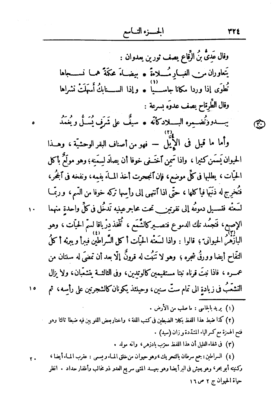 «2» - فهو من أصناف البقر الوحشيّة، وهذا الحيوان يسمن كثيرا، واذا سمن اختفى خوفا أن يصاد لسمنه؛ وهو مولع بأكل الحيّات، يطلبها فى كلّ موضع، فإن انجحرت أخذ الماء بفمه، ونفخه فى الحجر، فتخرج له ذنبها فيأكلها، حتّى اذا انتهى إلى رأسها تركه خوفا من السّم، وربّما لسعته فتسيل دموعه إلى نقرتين تحت محاجر عينيه تدخل فى كلّ واحدة منهما الإصبع، فتجمد تلك الدموع فتصير كالشّمع، تتّخذ درياقا لسمّ الحيّات، وهو البازهر «3» الحيوانىّ؛ قالوا: واذا لسعته الحيّات أكل السّراطين «4» فيبرأ ويبرئه أكل التفّاح أيضا وورق شجره؛ وهو لا تنبت له قرون إلّا بعد أن تمضى له سنتان من عمره، فاذا نبت قرناه نبتا مستقيمين كالوتدين، وفى الثالثة يتشعّبان، ولا يزال التشعّب فى زيادة الى تمام ستّ سنين، وحينئذ يكونان كالشجرتين على رأسه، ثم