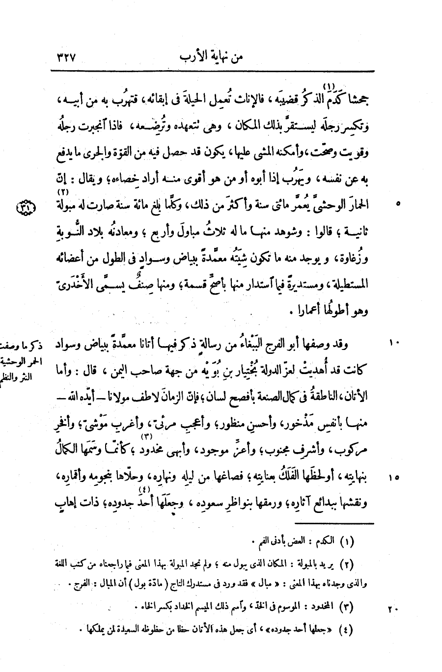 وقد وصفها أبو الفرج الببغاء من رسالة ذكر فيها أتانا معمّدة ببياض وسواد كانت قد أهديت لعزّ الدولة بختيار بن بويه من جهة صاحب اليمن، قال: وأما الأتان، الناطقة فى كمال الصنعة بأفصح لسان؛ فإنّ الزمان لاطف مولانا- أيّده الله- منها بأنفس مذخور، وأحسن منظور؛ وأعجب مرئىّ، وأغرب موشىّ؛ وأفخر مركوب، وأشرف مجنوب؛ وأعزّ موجود، وأبهى مخدود «3» ؛ كأنّما وسمها الكمال بنهايته، أو لحظها الفلك بعنايته؛ فصاغها من ليله ونهاره، وحلّاها بنجومه وأقماره، ونقشها ببدائع آثاره؛ ورمقها بنواظر سعوده، وجعلها أحد «4» جدوده؛ ذات إهاب