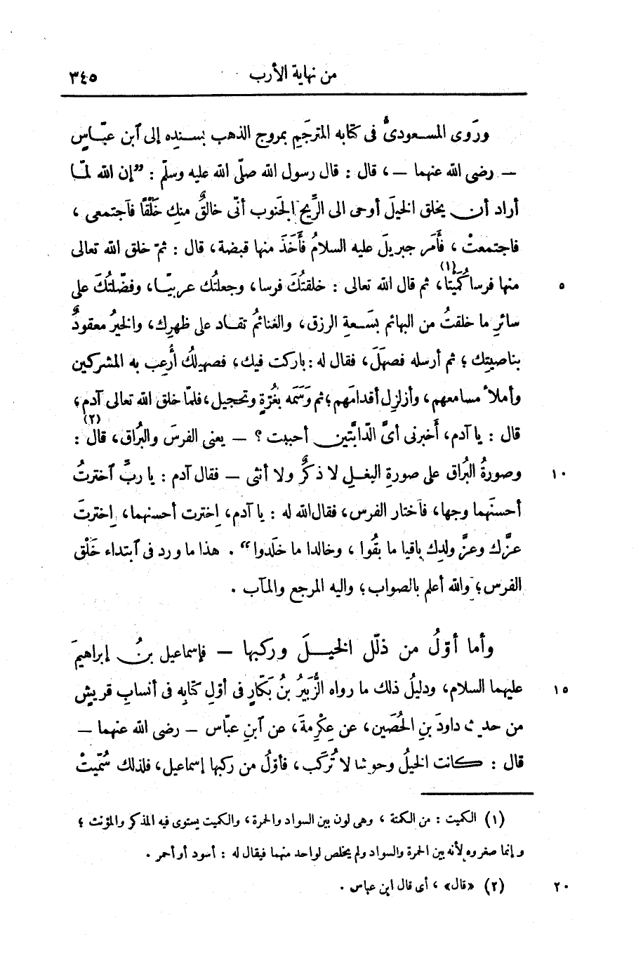وأما أوّل من ذلّل الخيل وركبها- فإسماعيل بن إبراهيم عليهما السلام، ودليل ذلك ما رواه الزّبير بن بكّار فى أوّل كتابه فى أنساب قريش من حديث داود بن الحصين، عن عكرمة، عن ابن عبّاس- رضى الله عنهما- قال: كانت الخيل وحوشا لا تركب، فأوّل من ركبها إسماعيل، فلذلك سمّيت